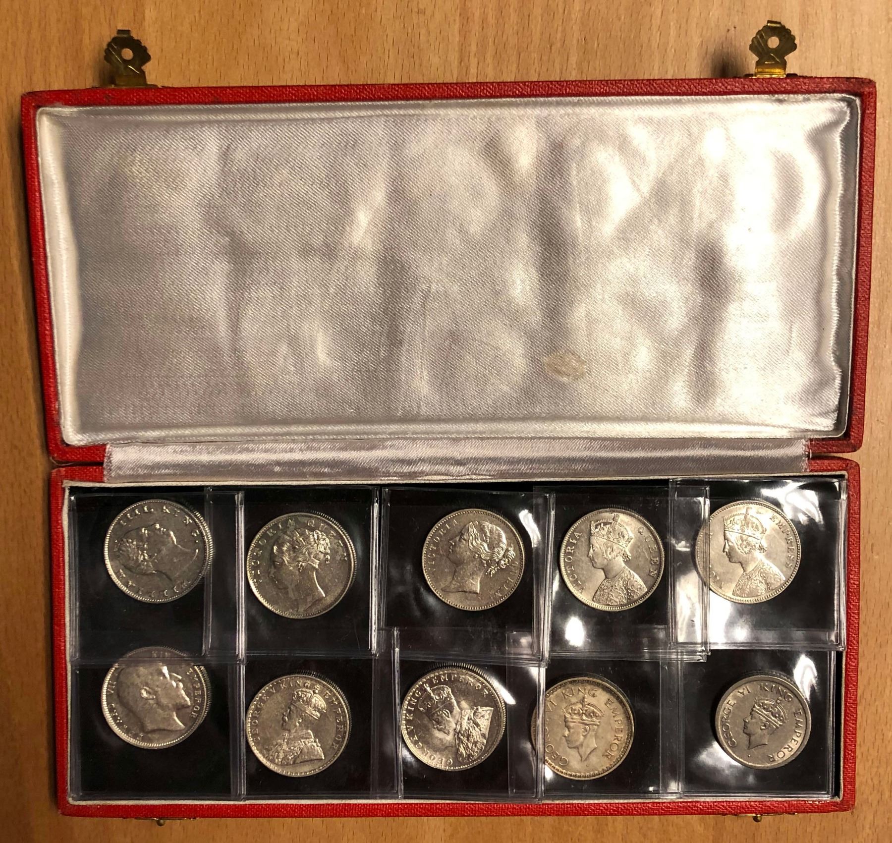 BRITISH INDIA:TYPE SET of 10 cased silver rupees including William IV, Victoria (4), Edward VII, George V (2), George VI (2); most are in AU quality, a lovely set in a red plush older custom holder, retail value $500, set of 10 coins.