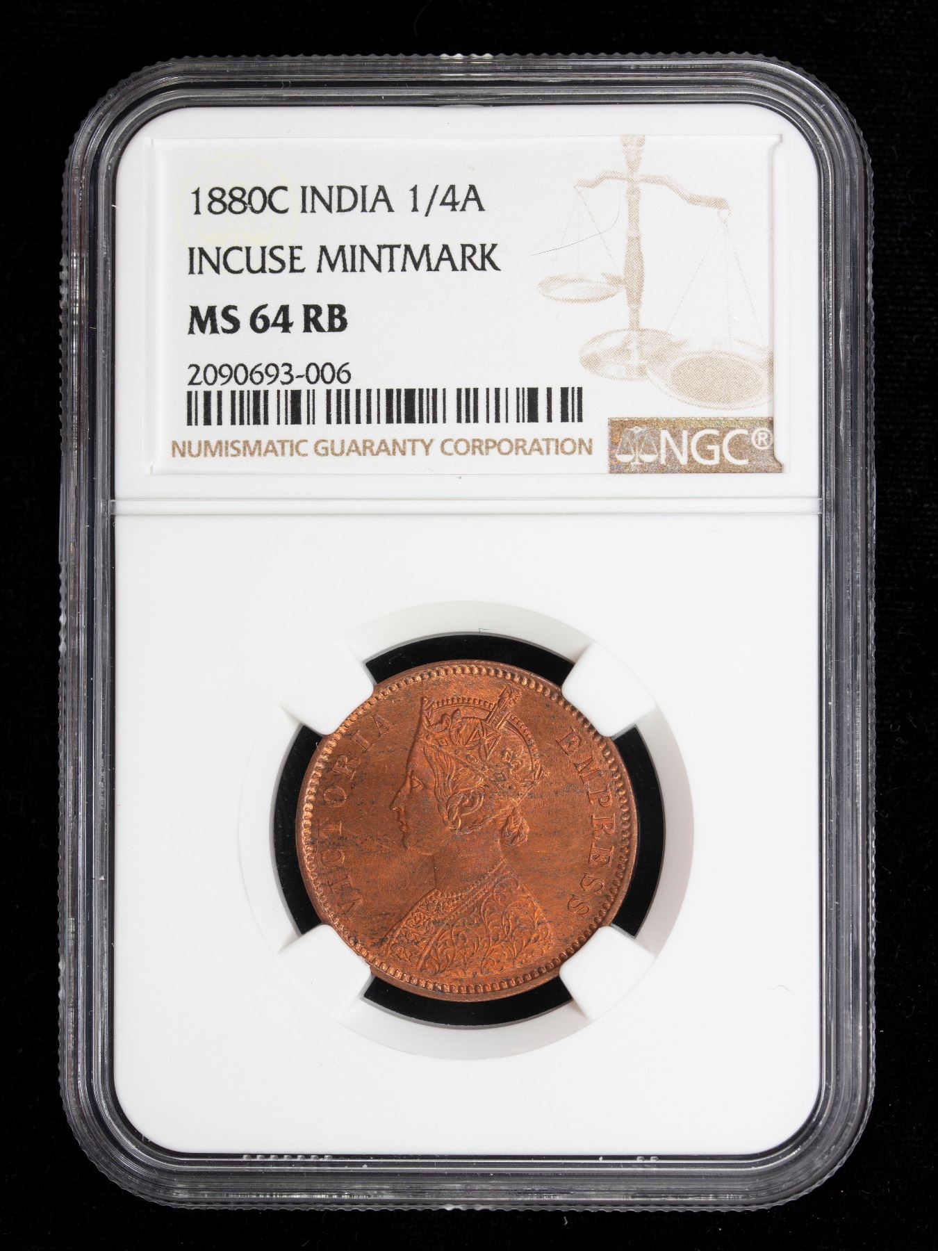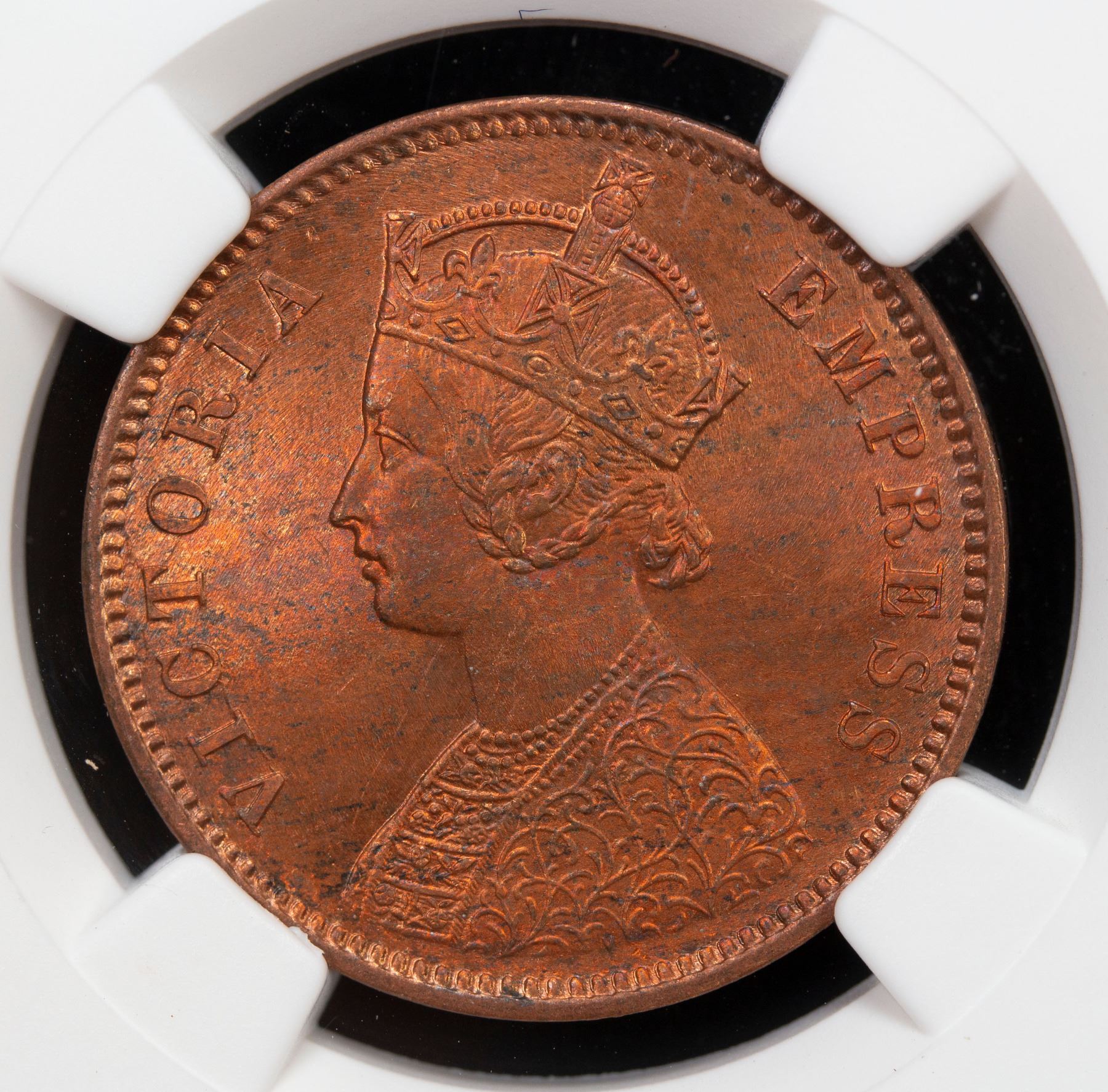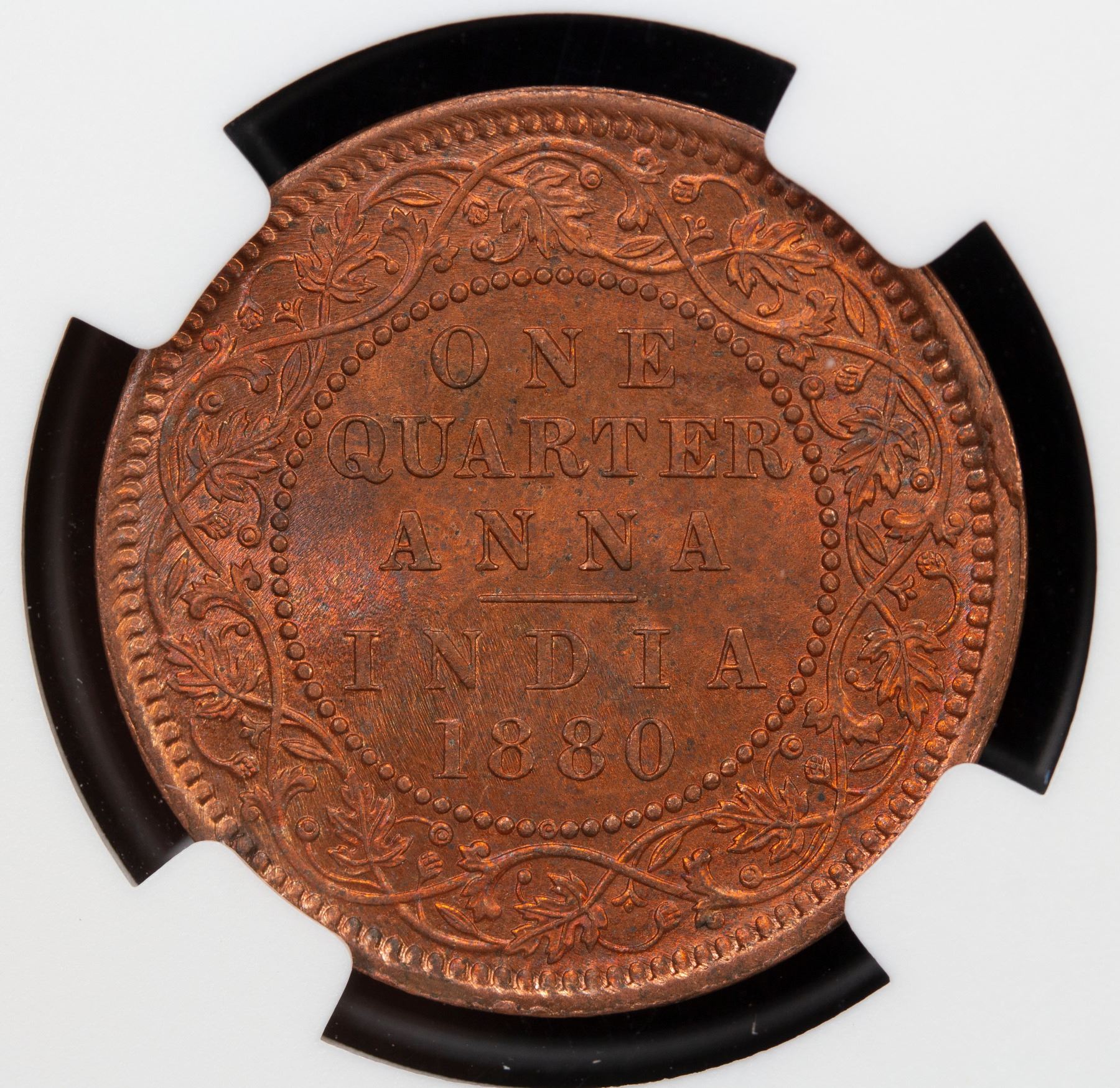 BRITISH INDIA: Victoria, Empress, 1876-1901, AE ¼ anna, 1880(c), KM-486, NGC graded MS64 RB.