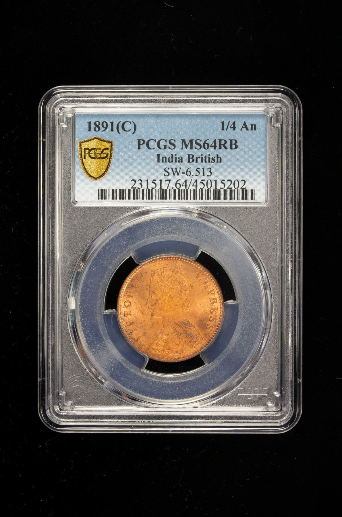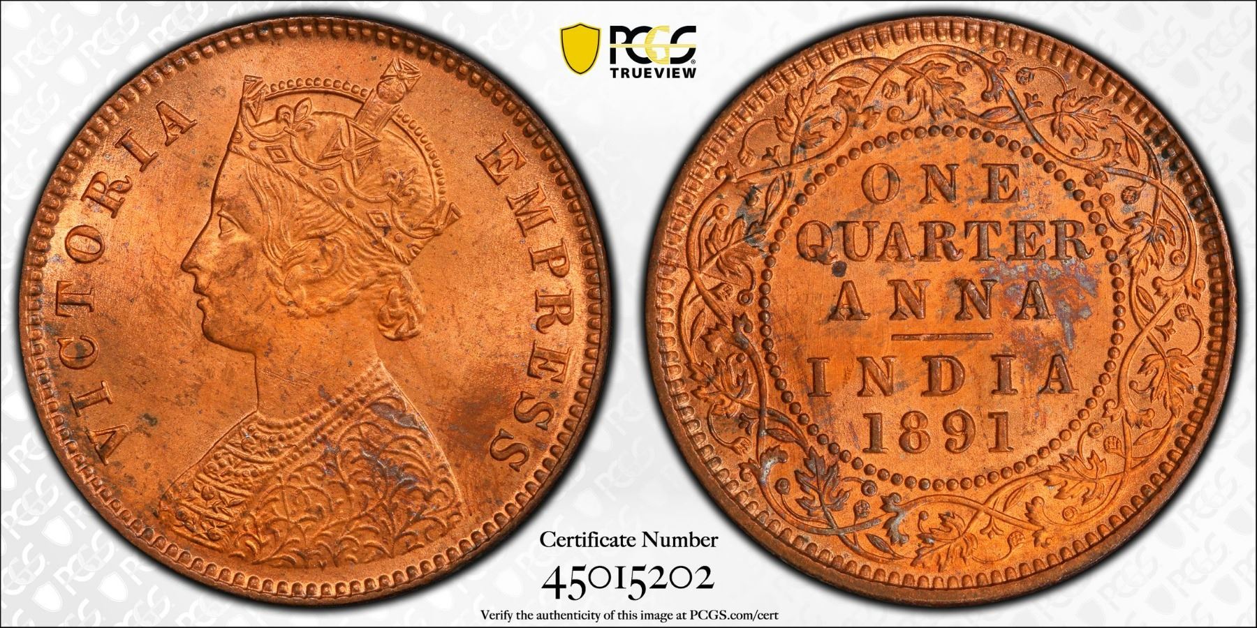BRITISH INDIA: Victoria, Empress, 1876-1901, AE 1/4 anna, 1891(c), PCGS MS64 RB