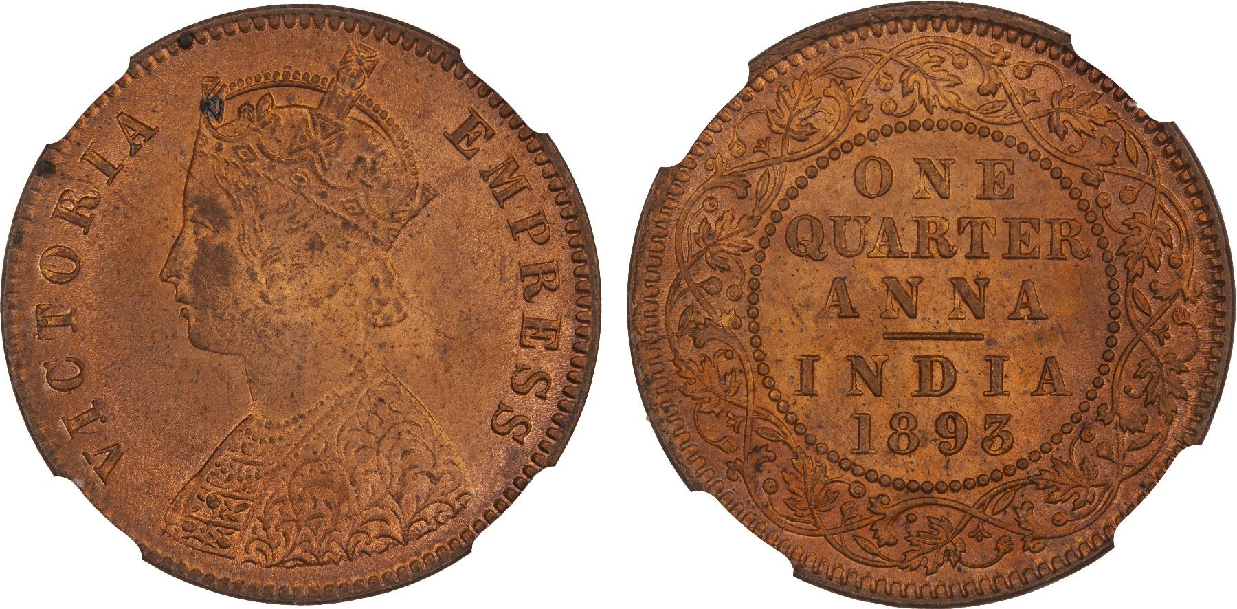 BRITISH INDIA: Victoria, Empress, 1876-1901, AE 1/4 anna, 1893(c), NGC MS65 RD