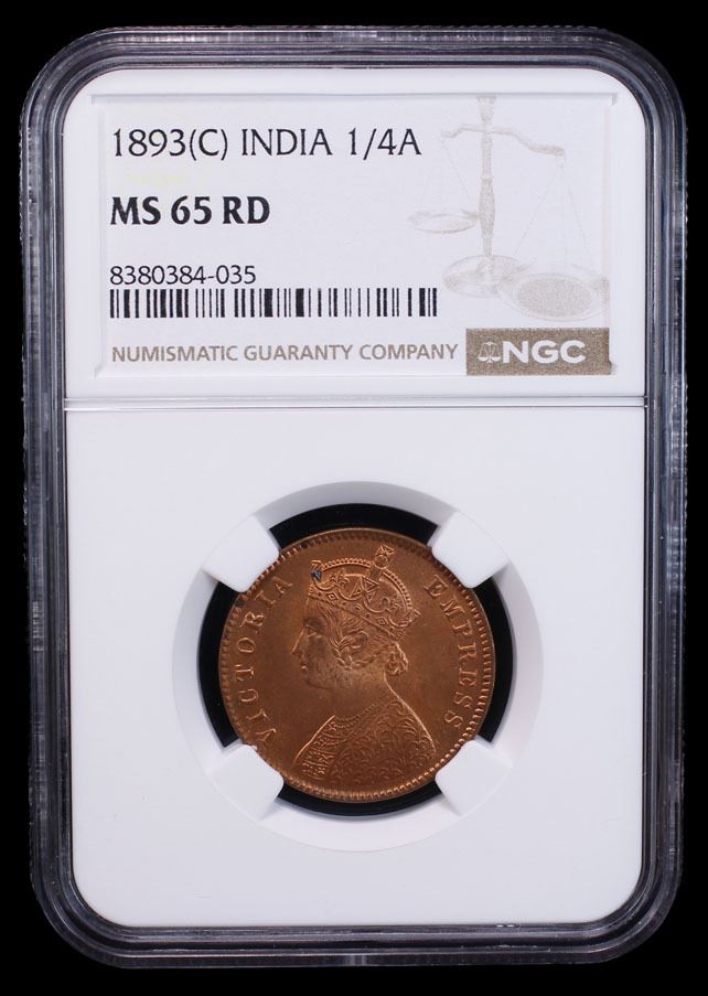 BRITISH INDIA: Victoria, Empress, 1876-1901, AE 1/4 anna, 1893(c), KM-486, S&W-6.523, brilliant full red color, NGC graded MS65 RD.