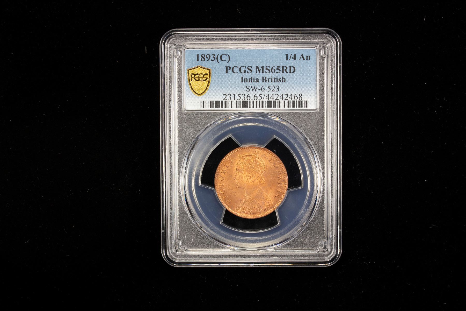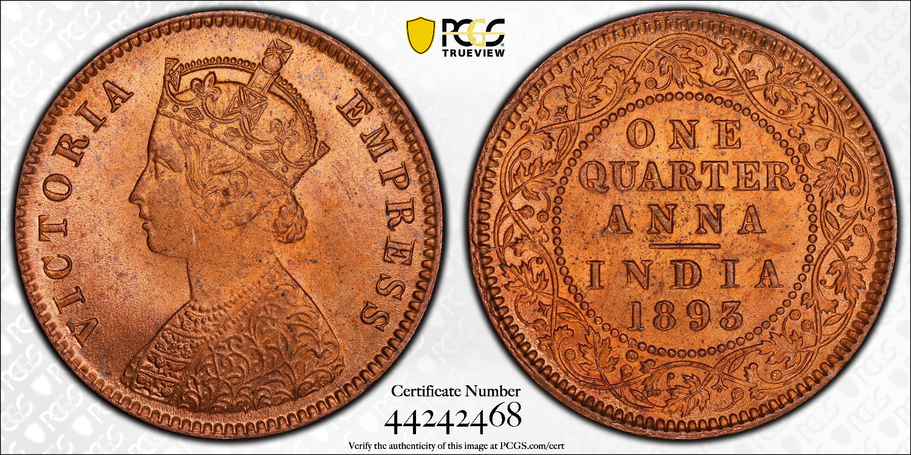 BRITISH INDIA: Victoria, Empress, 1876-1901, AE 1/4 anna, 1893(c), PCGS MS65 RD