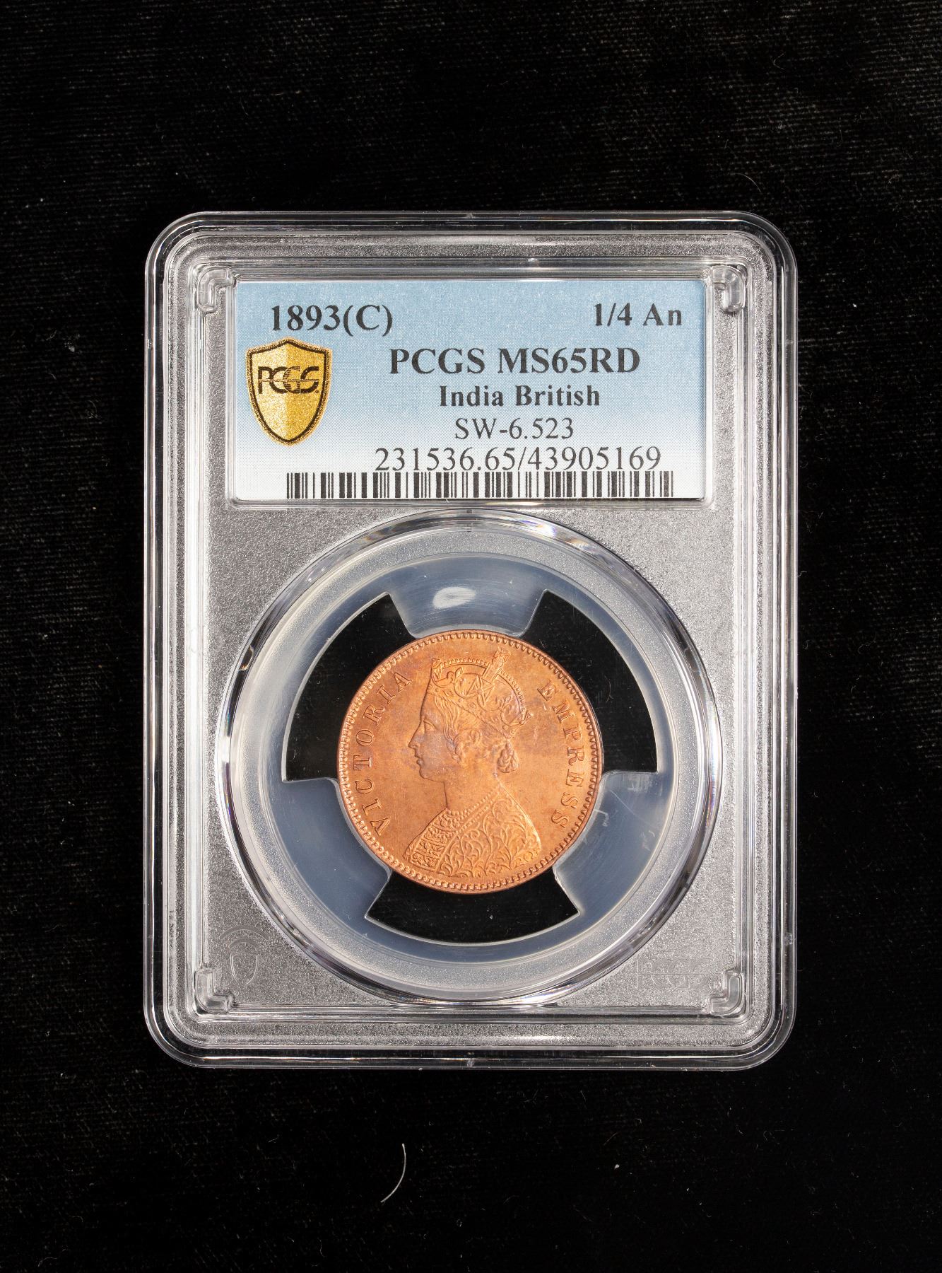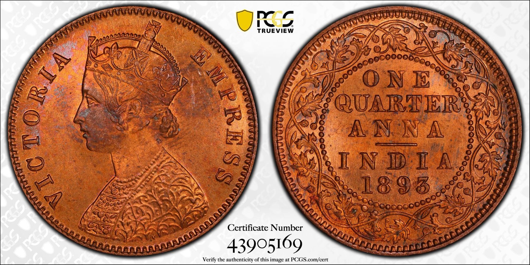 BRITISH INDIA: Victoria, Empress, 1876-1901, AE ¼ anna, 1893(c), PCGS MS65 RD