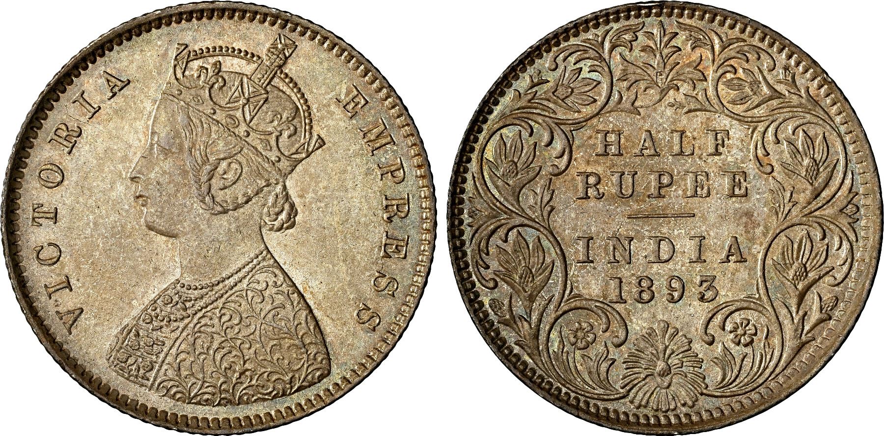 BRITISH INDIA: Victoria, Empress, 1876-1901, AR 1/2 rupee, 1893-B, NGC MS64