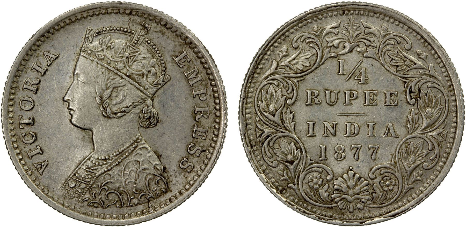 BRITISH INDIA: Victoria, Empress, 1876-1901, AR 1/4 rupee, 1877(b), EF