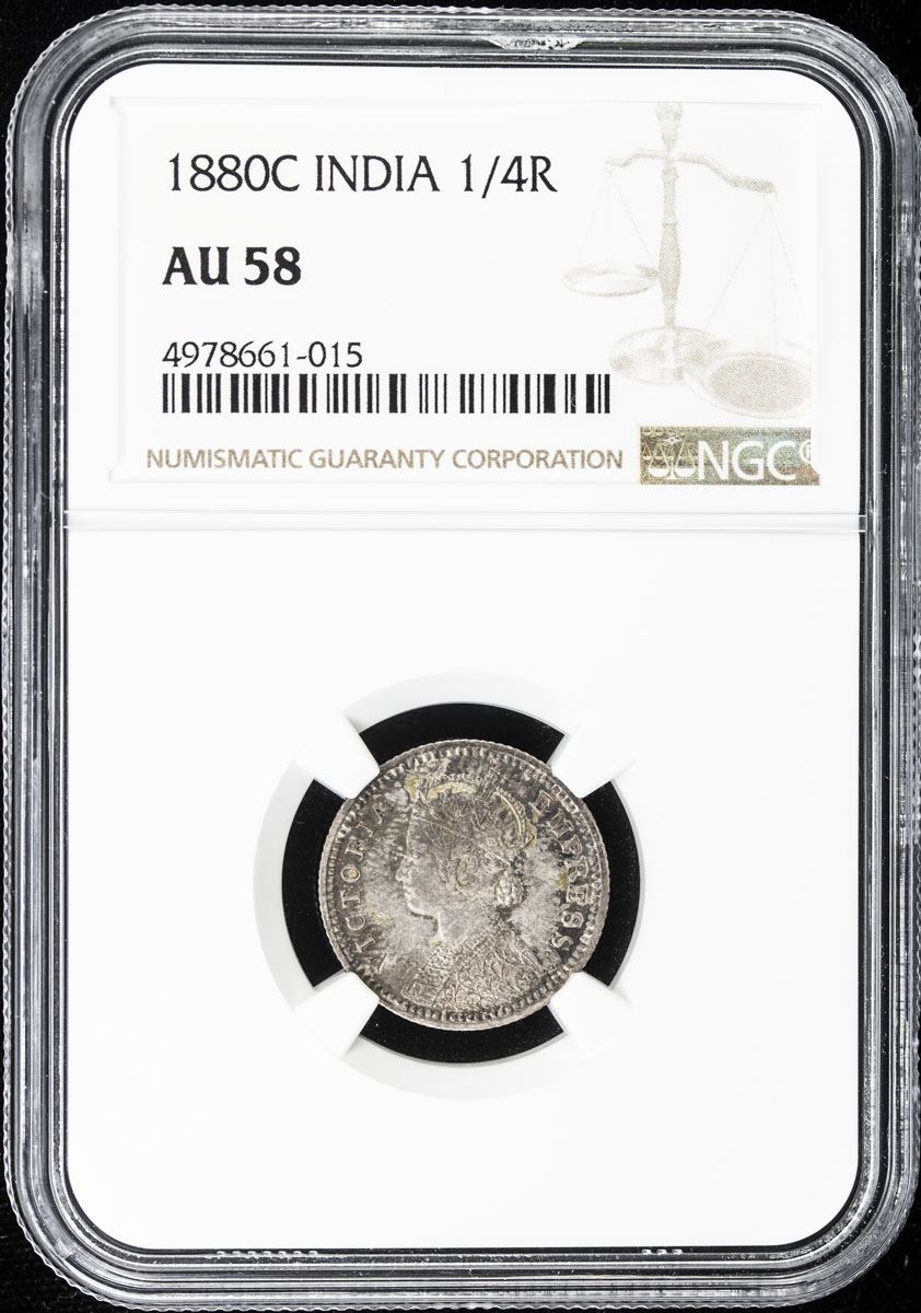 BRITISH INDIA: Victoria, Empress, 1876-1901, AR ¼ rupee, 1880-C, KM-490, lovely old toning, a very rare date and nearly mint state quality! NGC graded AU58, RR.