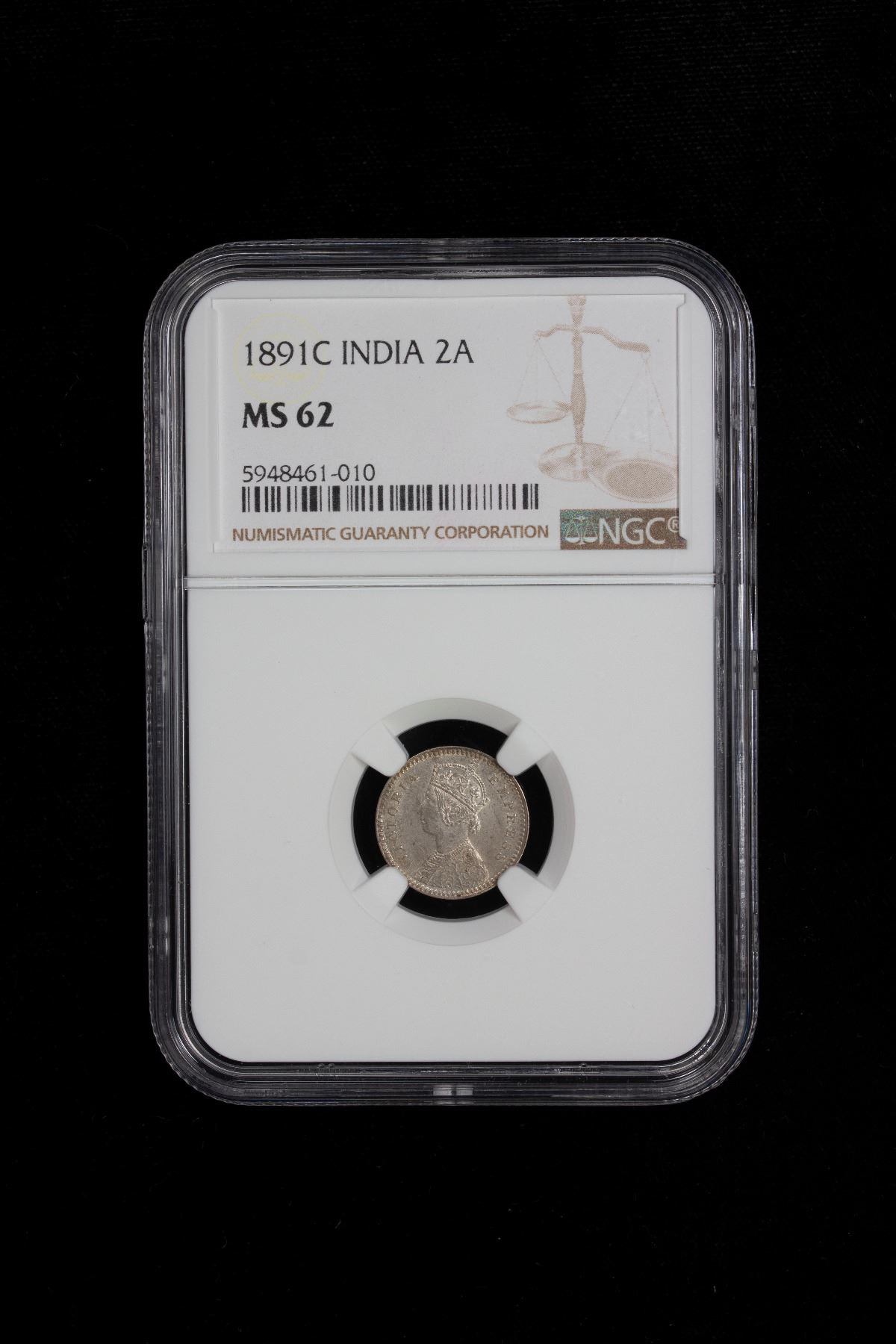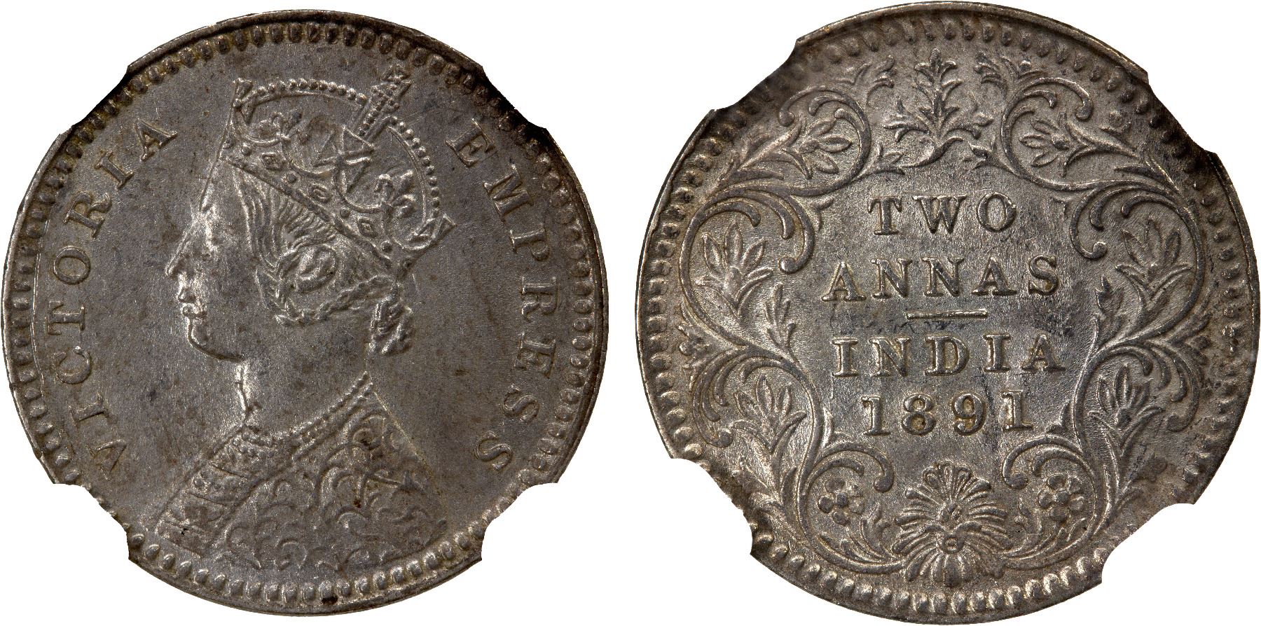 BRITISH INDIA: Victoria, Empress, 1876-1901, AR 2 annas, 1891-C, NGC graded MS62