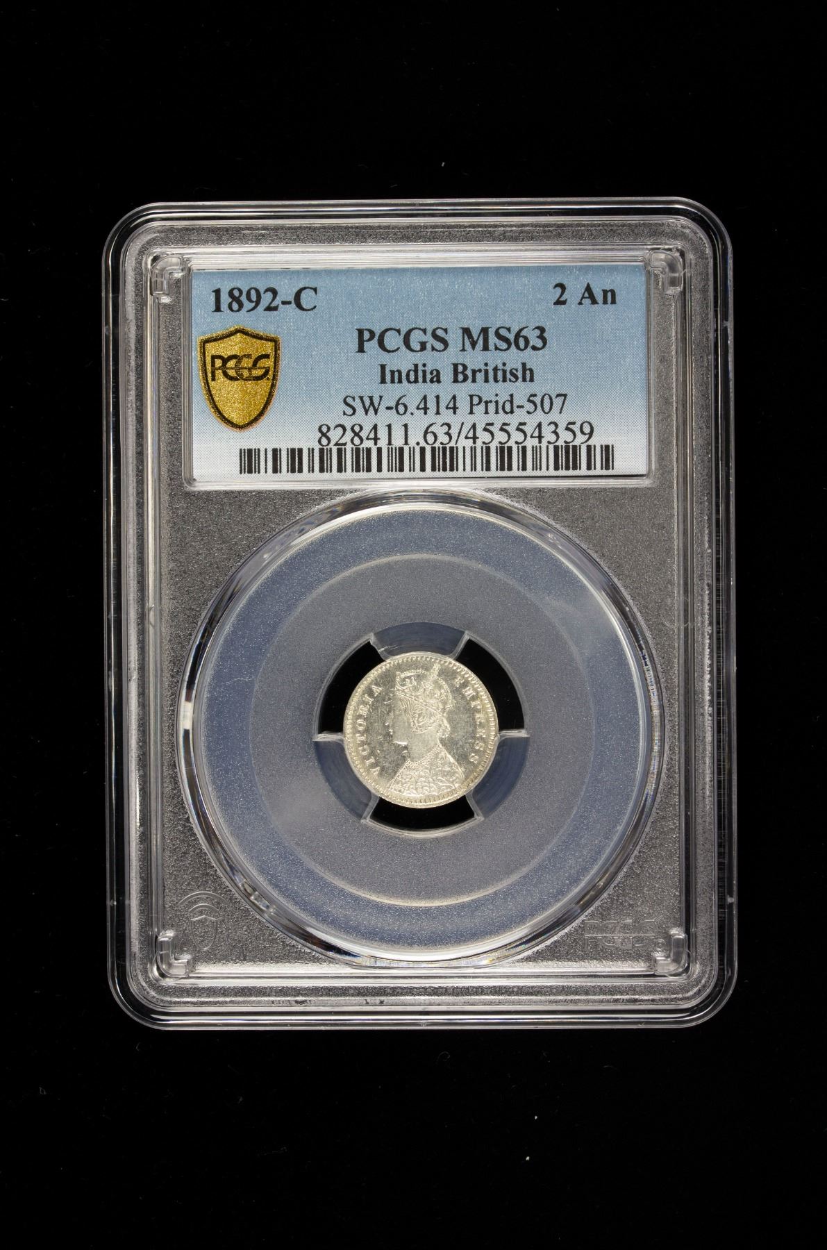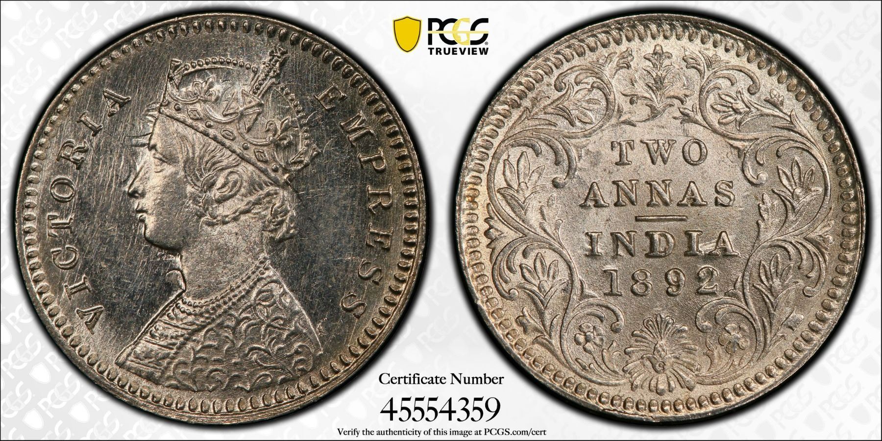 BRITISH INDIA: Victoria, Empress, 1876-1901, AR 2 annas, 1892-C, PCGS MS63