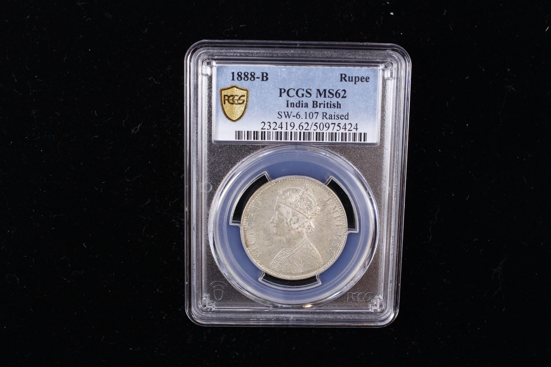 BRITISH INDIA: Victoria, Empress, 1876-1901, AR rupee, 1888-B, KM-492, S&W-6.107, raised mint mark, a pleasing lustrous example, PCGS graded MS62.