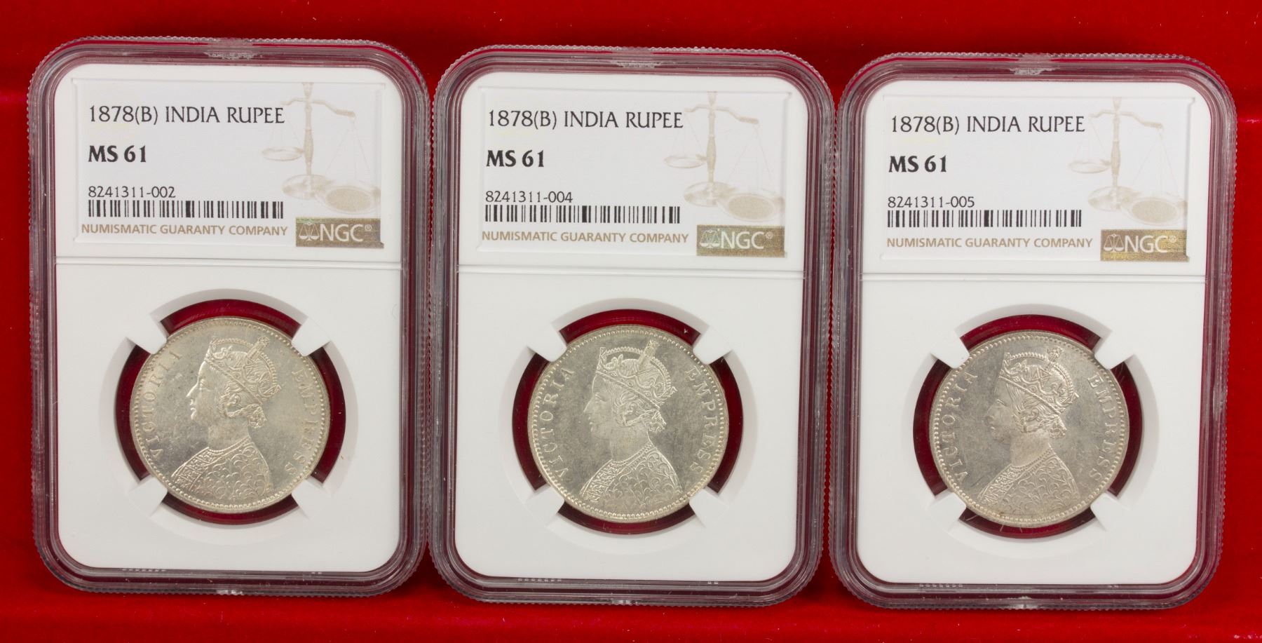 BRITISH INDIA: Victoria, Empress, 1876-1901, LOT of 3 silver rupees, type A-492, 1878(b), all graded by NGC as MS61; pleasing examples; retail value $400, lot of 3 pieces.