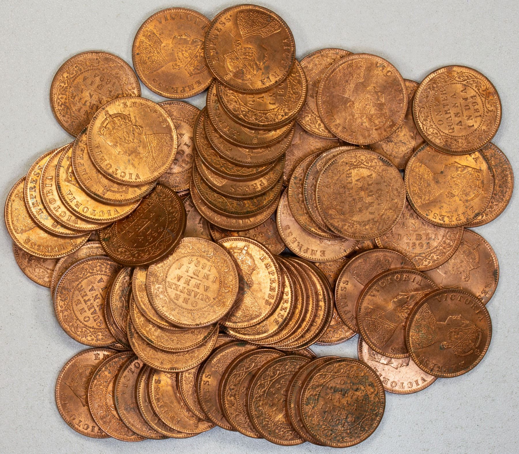 BRITISH INDIA: Victoria, Empress, 1876-1901, LOT of 72 coins, large accumulation of AE 1/4 anna coins dated 1894 from the Calcutta mint KM-486 type, all with red luster, AU-UNC quality, retail value $1800, lot of 72 coins.