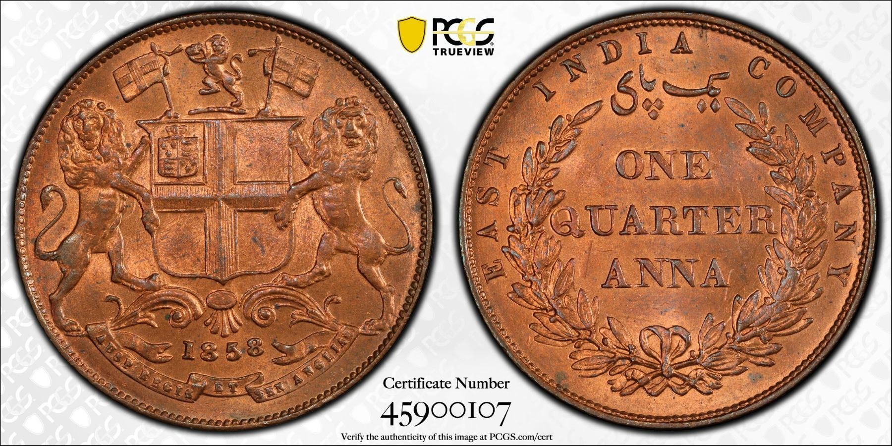 BRITISH INDIA: Victoria, Queen, 1837-1876, AE 1/4 anna, 1858(h), PCGS MS64 RB