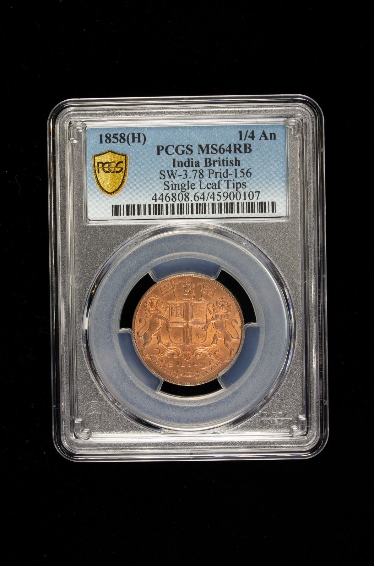 BRITISH INDIA: Victoria, Queen, 1837-1876, AE ¼ anna, 1858(h), KM-463.1, S&W-3.78, Prid-156, East India Company issue, type B/1, single leaf at ends of wreath, PCGS graded MS64 RB. Struck at the Heaton mint, Birmingham, a wonderful lustrous example! PCGS graded MS64 RB.