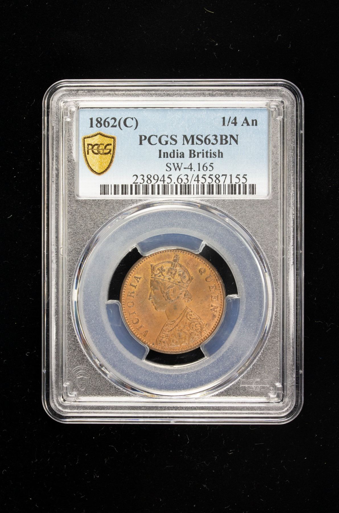 BRITISH INDIA: Victoria, Queen, 1837-1876, AE 1/4 anna, 1862(c), PCGS MS63 BN