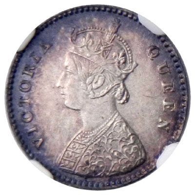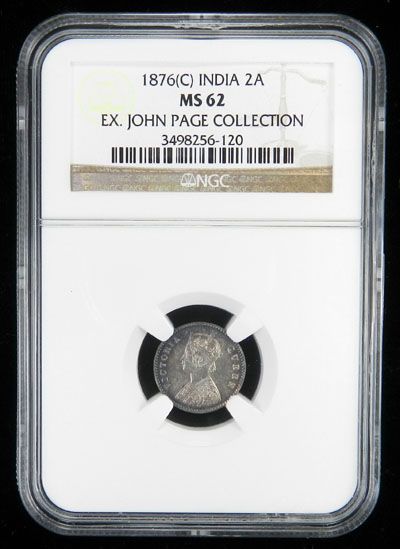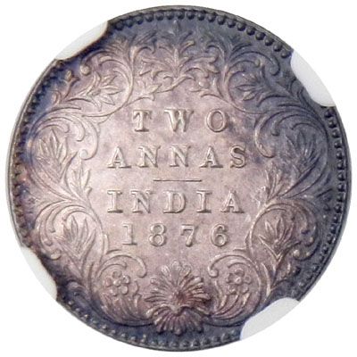 BRITISH INDIA: Victoria, Queen, 1837-1876, AR 2 annas, 1876(c), KM-469, Y-9, NGC graded MS62, ex. John Page Collection.