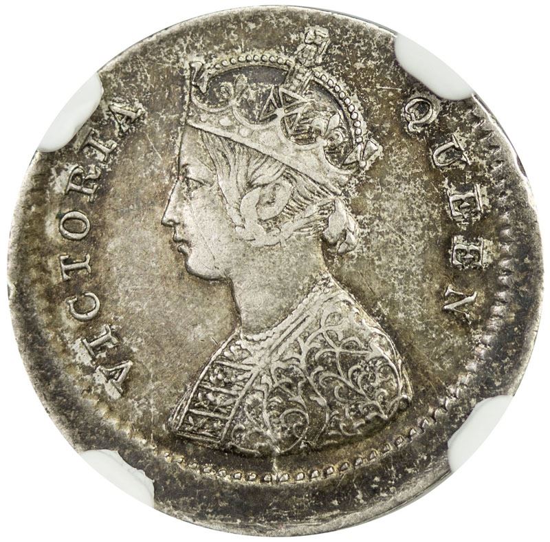 BRITISH INDIA: Victoria, Queen, 1837-1876, AR 2 annas, ND1862(c), KM-469, 15% struck off-center, NGC graded AU55.