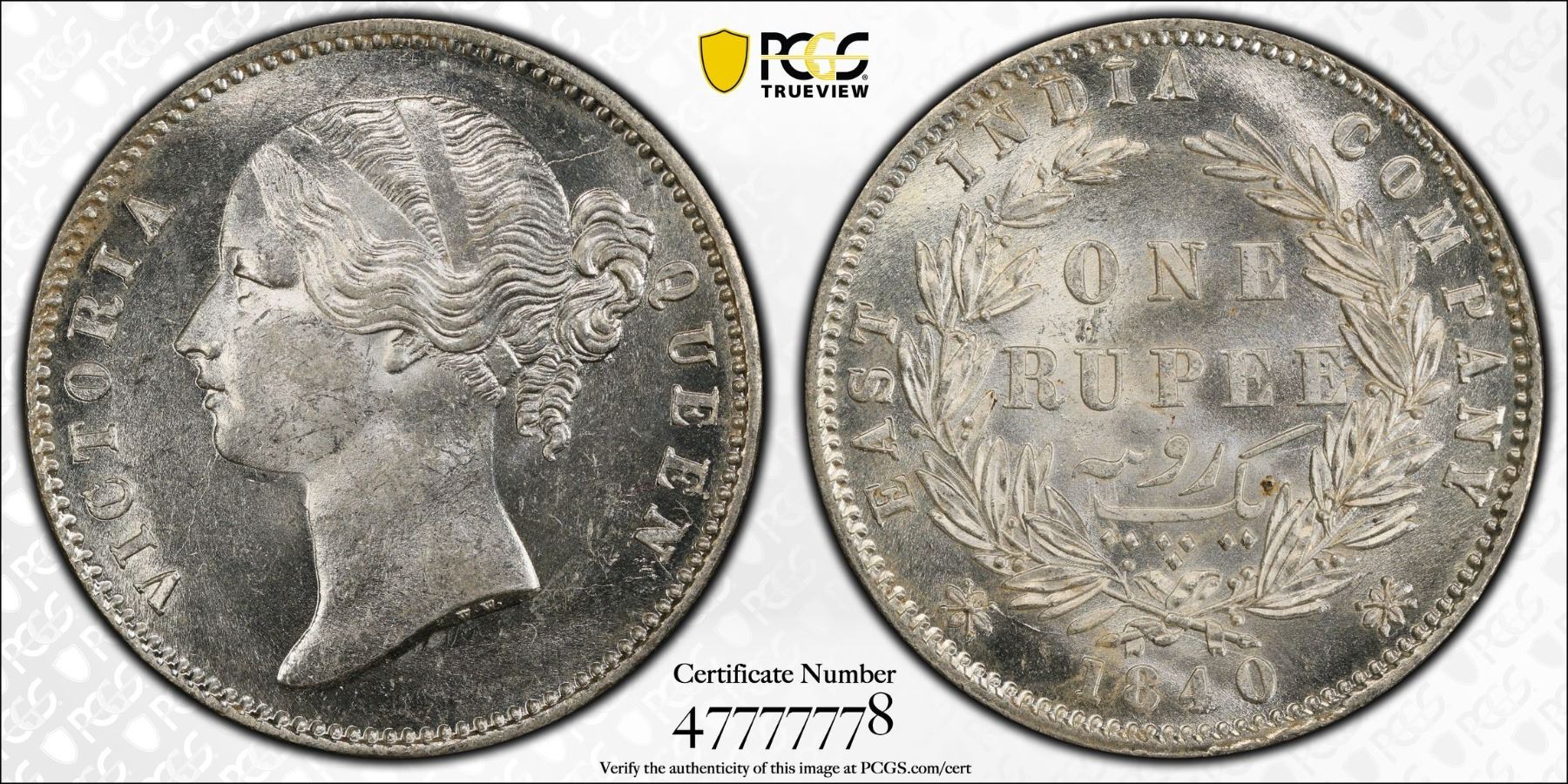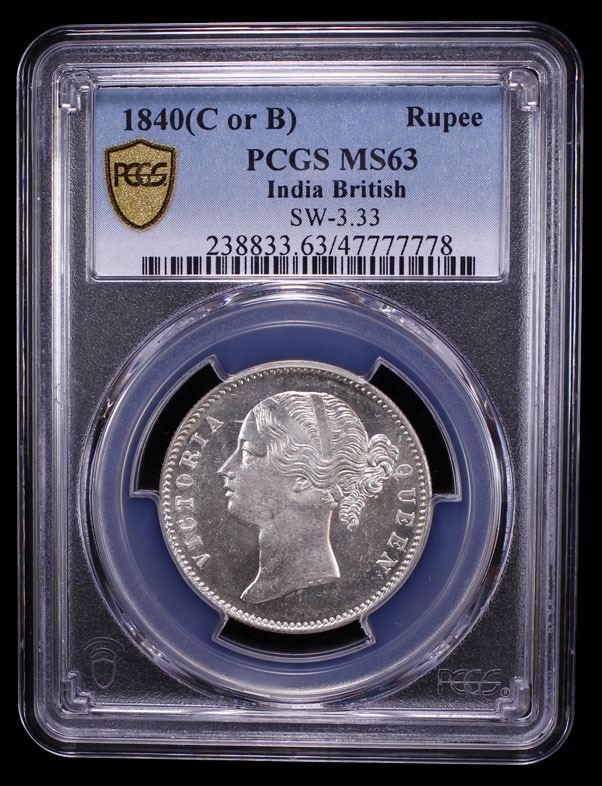 BRITISH INDIA: Victoria, Queen, 1837-1876, AR rupee, 1840(b&c), PCGS MS63