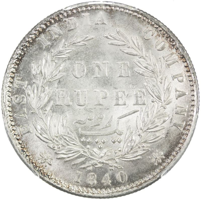 BRITISH INDIA: Victoria, Queen, 1837-1876, AR rupee, 1840(c), KM-458.2, Prid-56/57, S&W-3.33, W.W. raised on truncation, type A/I, PCGS graded MS62.