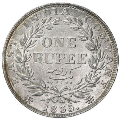 BRITISH INDIA: William IV, 1830-1837, AR rupee, 1835, KM-450.3, East India Company issue, F incuse, Almost Unc to Unc.