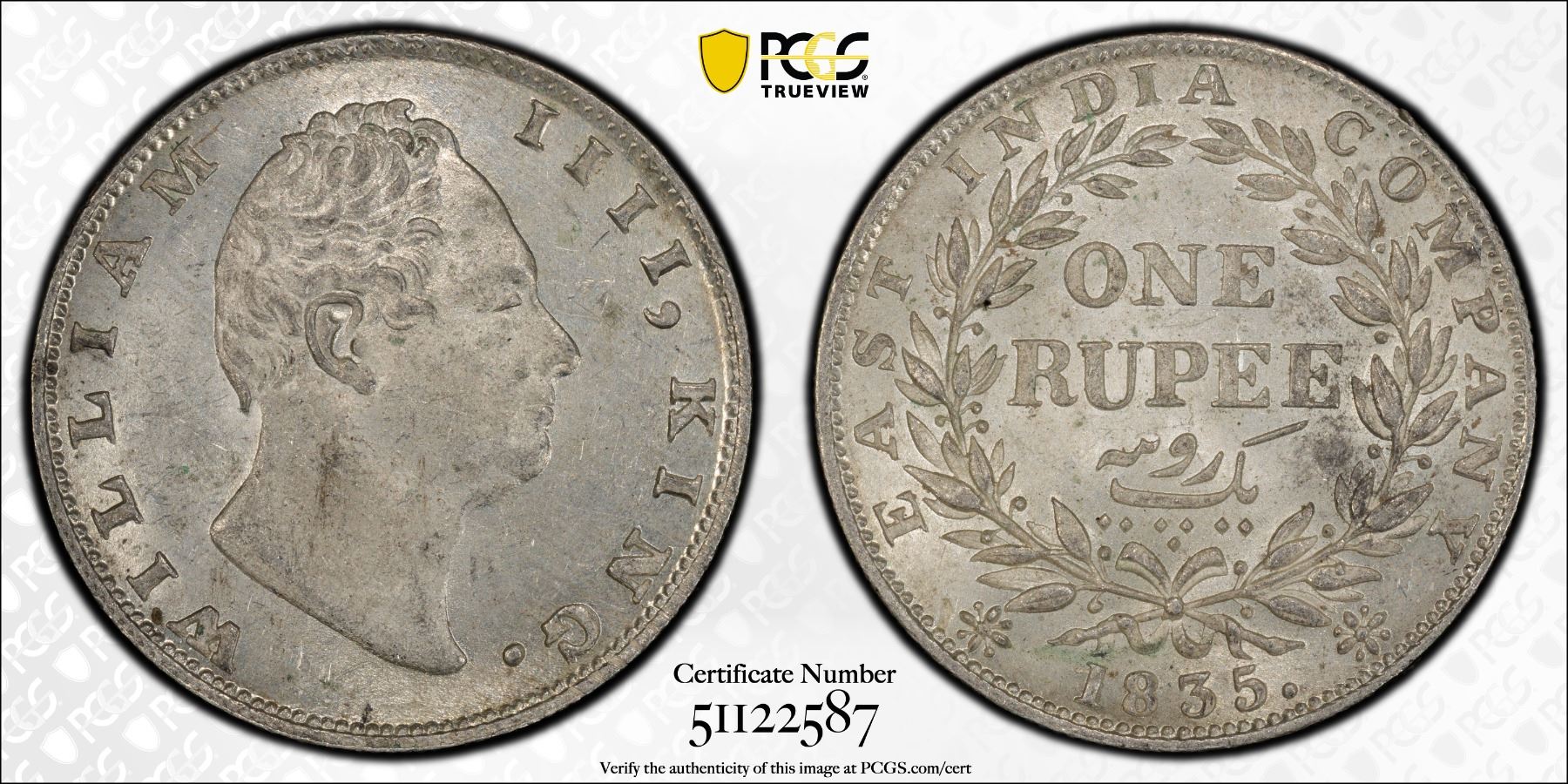BRITISH INDIA: William IV, 1830-1837, AR rupee, 1835(c), KM-450.3, S&W-1.39, Prid-34, East India Company issue, type C/I, with F incuse on truncation, a pleasing lustrous mint state example, PCGS graded MS62.