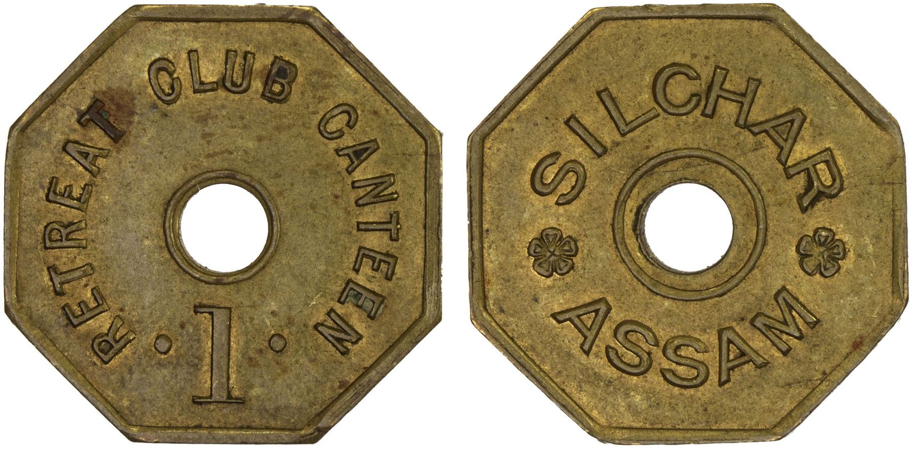 BRITISH INDIA: brass 1 anna token, ND (ca. 1930), Prid-201, cf. Zeno-102736, octagonal with center hole as made, for use at the Retreat Club Canteen at Silchar, Assam, a few faint hairlines, traces of luster, XF-AU.