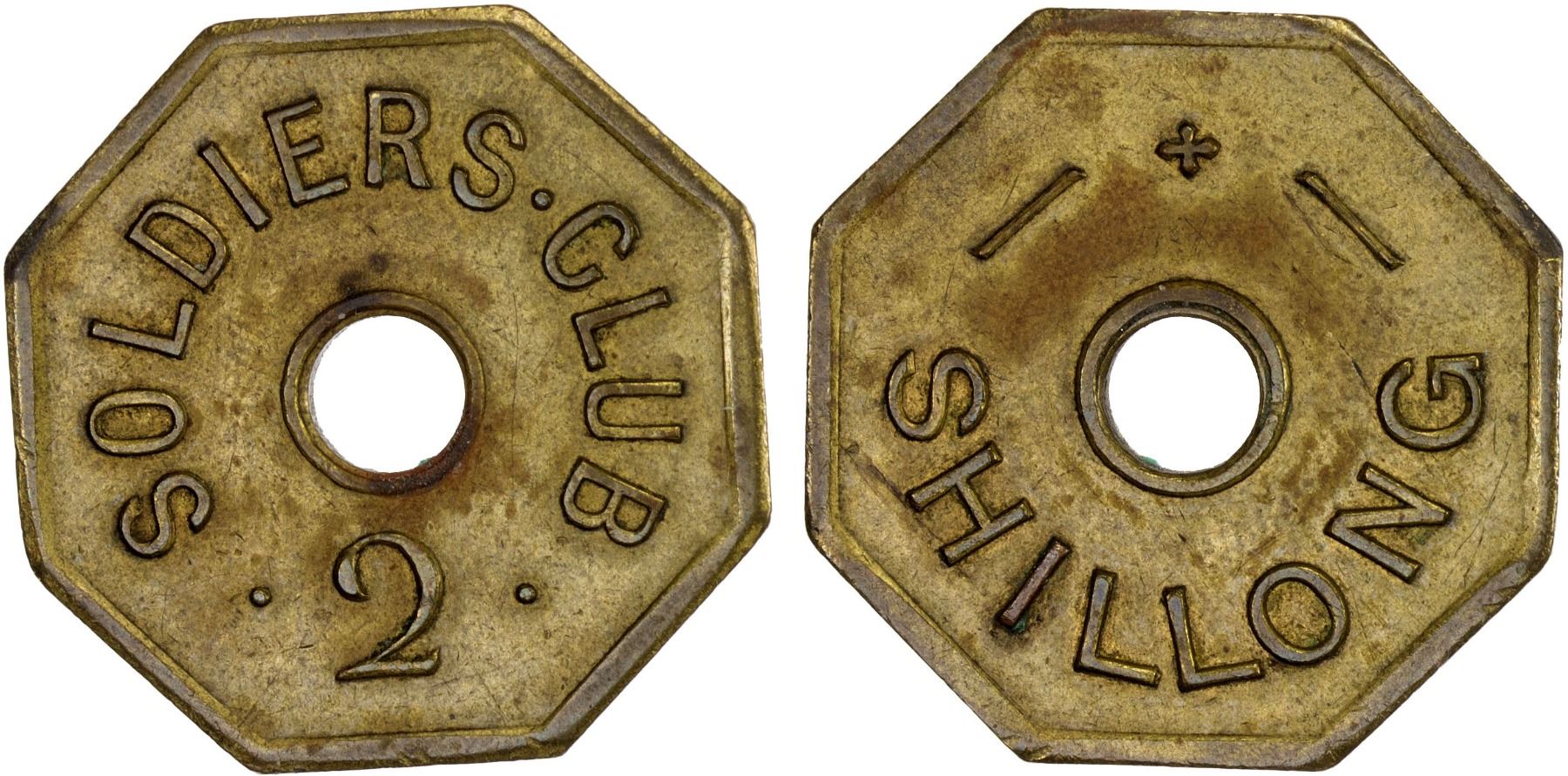 BRITISH INDIA: brass 2 annas token, ND (ca. 1943), Prid--, octagonal with center hole as made, for use as the Soldier's Club at Shillong, Meghalaya, XF. This club was probably affiliated with the Shillong Club, established in 1878.