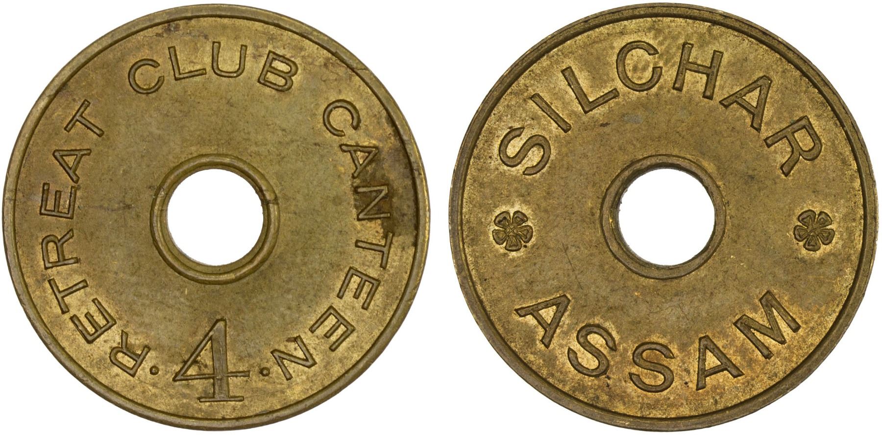 BRITISH INDIA: brass 4 annas token, ND (ca. 1930), Prid--, Thakkar-100.6.3, round with center hole as made, for use at the Retreat Club Canteen at Silchar, Assam, small spot on obverse, some luster, AU.