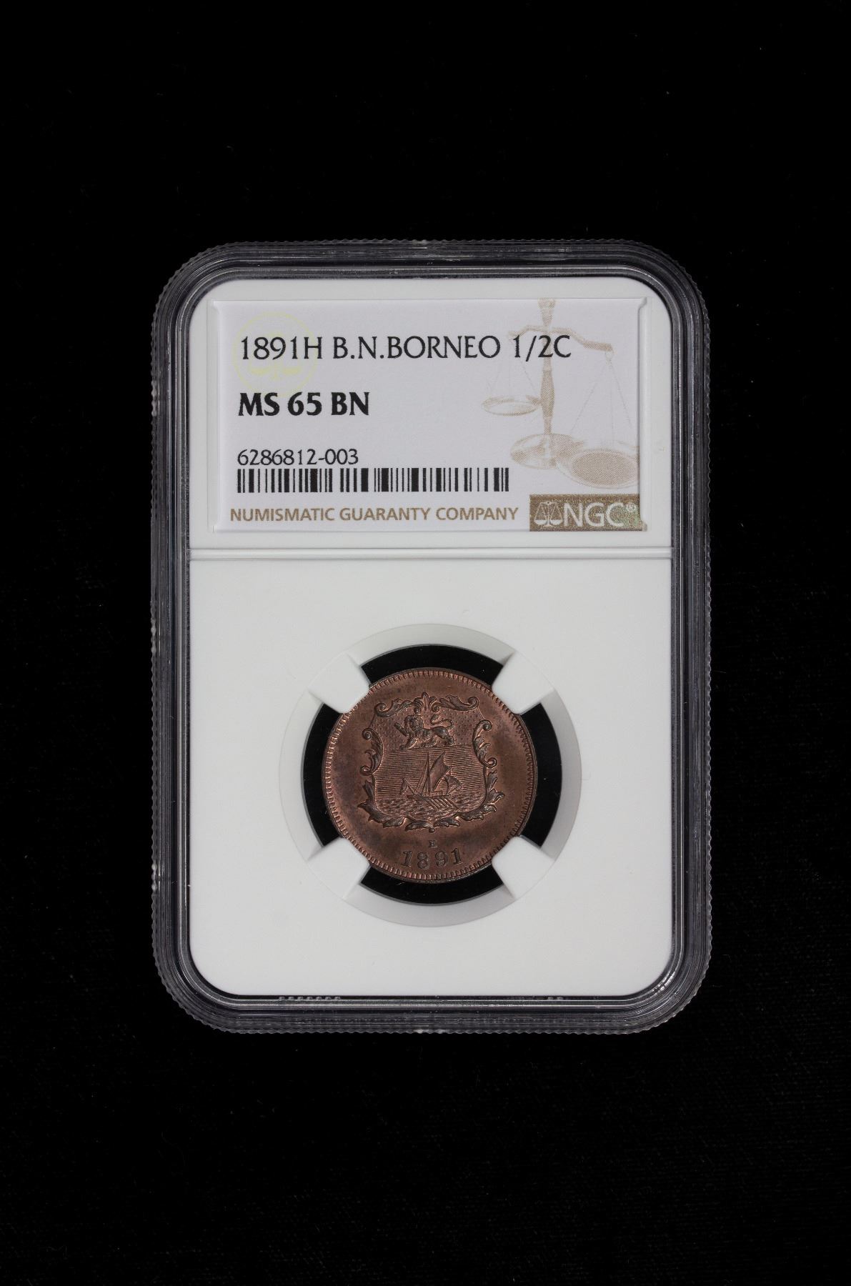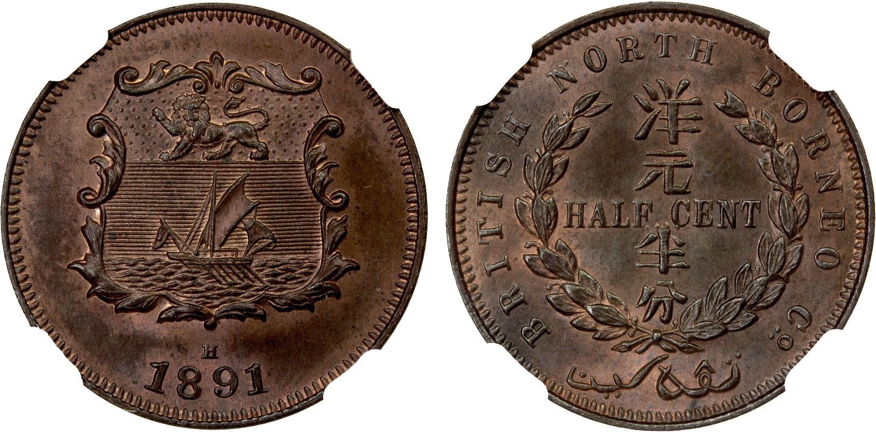 BRITISH NORTH BORNEO: AE 1/2 cent, 1891-H, KM-1, a superb example with much mint red! NGC graded MS65 BN. Only 5 coins graded higher by NGC.