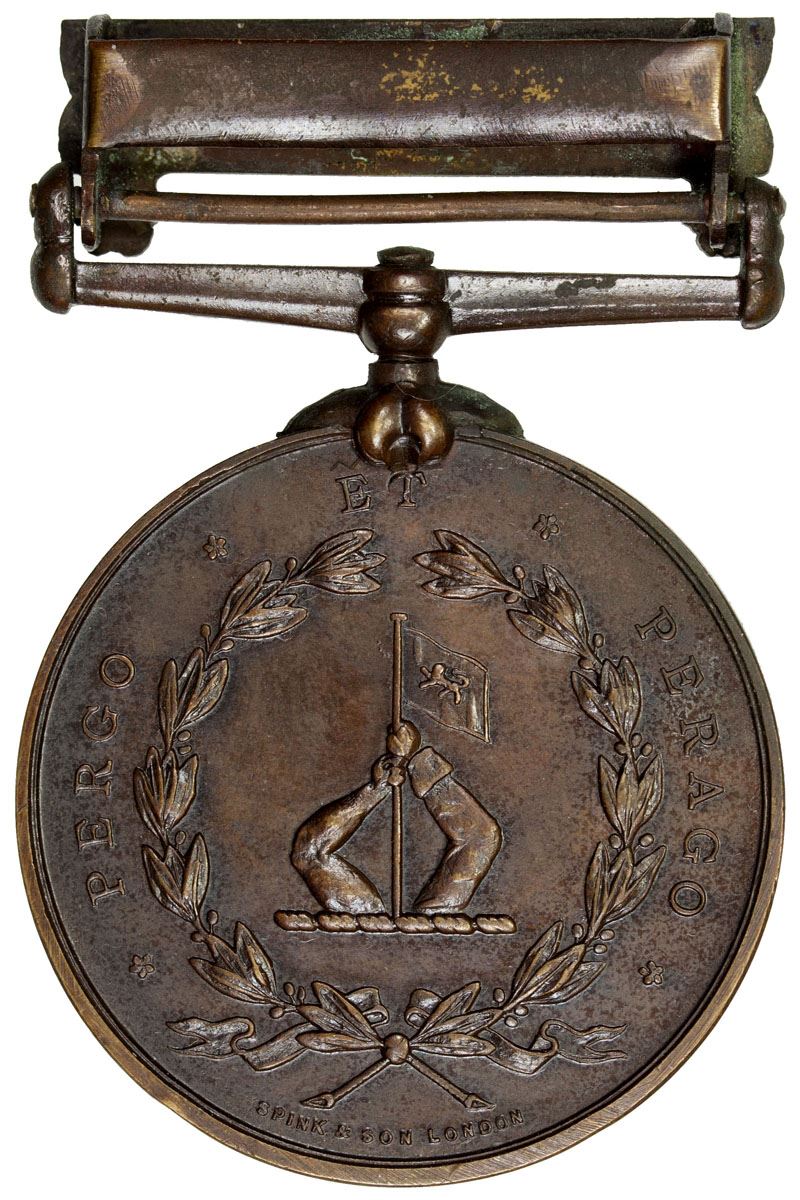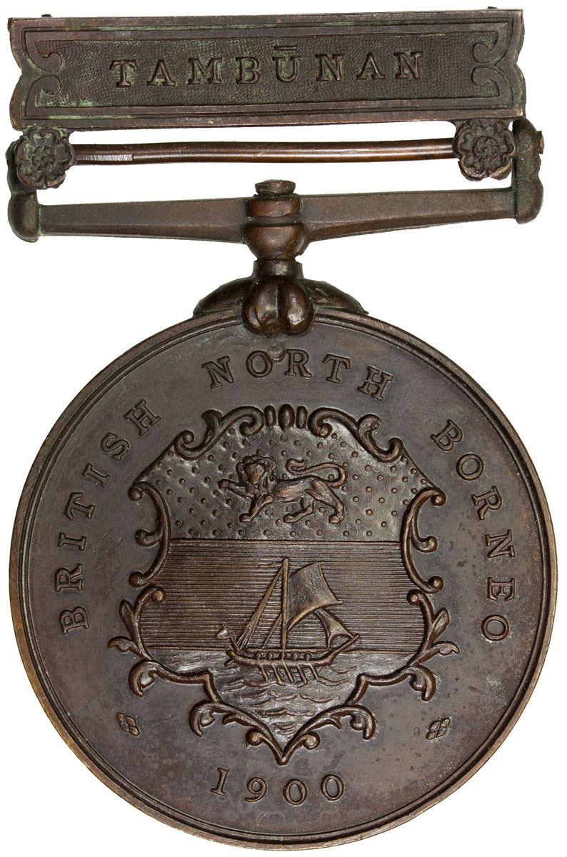 BRITISH NORTH BORNEO: British North Borneo Company, AE medal, 1900, Company shield, date below // arms holding up company flag from behind a wall, PERGO ET PERAGO around, signed by the manufacturer Spink & Son, London, stamped SPECIMEN on the edge, with hanger for Tambunan., About Unc, RR. Original issue - the later issues have the letter S of SON obliterated - and without name of the recipient. Mintage recorded as 125 pieces in bronze. Perhaps a sample or promotional specimen.