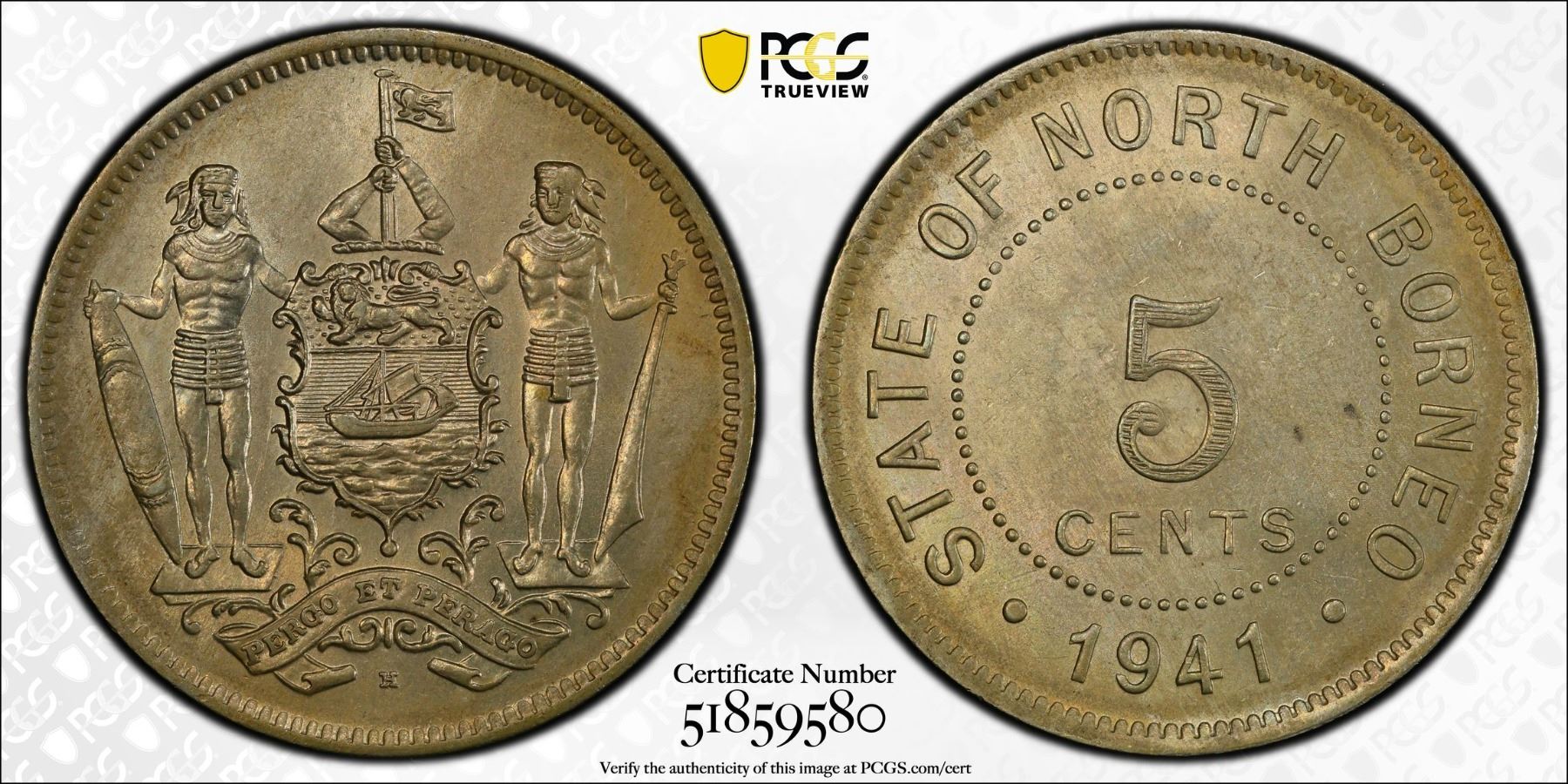 BRITISH NORTH BORNEO: Protectorate, 5 cents, 1941-H, PCGS MS62