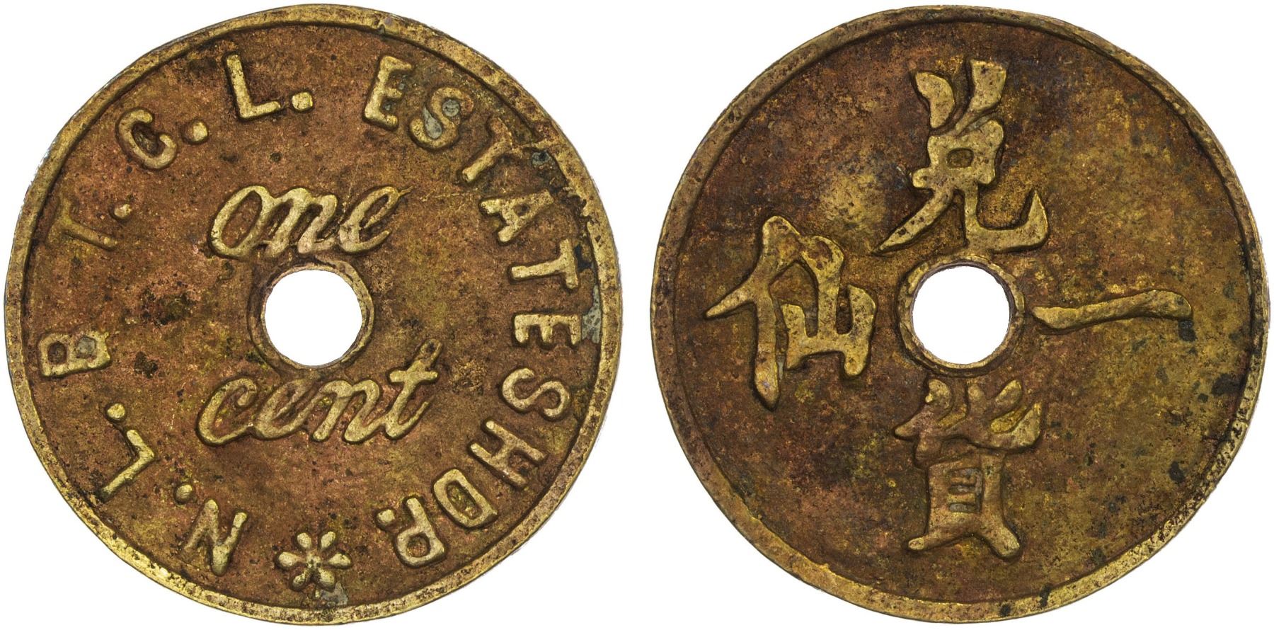 BRITISH NORTH BORNEO: brass cent token, ND, L&W-720, Pridmore-72, 25mm, N.L.B.T.C.L. (North Labuan British Trading Company Ltd.) ESTATE SHOP around central hole, ONE CENT above and below hole in cursive script // Chinese text and demonination, usual porosity, VF. The British North Borneo Company start to allow private estate tokens to circulate around 1882 at various tobacco, rubber and timber estates in the State of North Borneo. They stated currency shortage as the main reason to use private tokens but the actual reason is that it would be easy to control coolies (laborers) with private money. The coolies could not easily leave the plantations since they didn't have any normal circulating money (Mexico dollar, Hong Kong dollar, British Trade dollar etc.) for them to live outside the plantation. The coolies received monthly payment for their wages and each one of them had their own "debt record book". The book would record all their purchases at the shop (Kedai) in the plantation as well as their gambling debts and fines. The fines are for insufficient productivity on the plantation or for unauthorized absence from the plantation. Most of the plantation tokens were issued at the end of the 19th century. During that time, rapid development of tobacco estates in the East Indies can be seen with the cultivation of first-class tobacco crops. Many of the coolies were recruited from the southern China and that is why most of the tokens have Chinese language on them in addition to Dutch, English or German. In 1890, the United States increased the import tax on foreign tobacco, and this brought down the world tobacco price. By 1920, most of the tobacco estates had changed their production from tobacco to rubber. Due to various abuses, these tokens were brought under Government regulations of 1903, 1906 and 1912. Any individual estate or Company employing more than 100 laborers were empowered to issue monetary tokens only after seeking prior approval from the Government. Each token was not to exceed five dollars per issuer. A specimen of each type was required to be deposited at the Treasury at Sandakan as well as at the nearest District Office. The Vide Gazette published Notification No. 207 in 1920 that the issue of these private tokens as money was to be abolished. All employers in the various estates were required to forward to the local District Office at least 20 per cent of their total authorized issue of tokens for cancellation by the 31st December of each year henceforth. On 31 December 1924 the use of private tokens in the State of North Borneo came to an end.