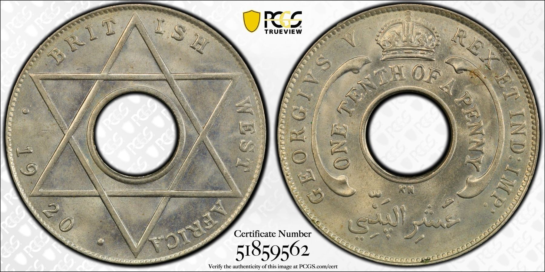BRITISH WEST AFRICA: George V, 1911-1936, 1/10 penny, 1920-KN, PCGS MS65