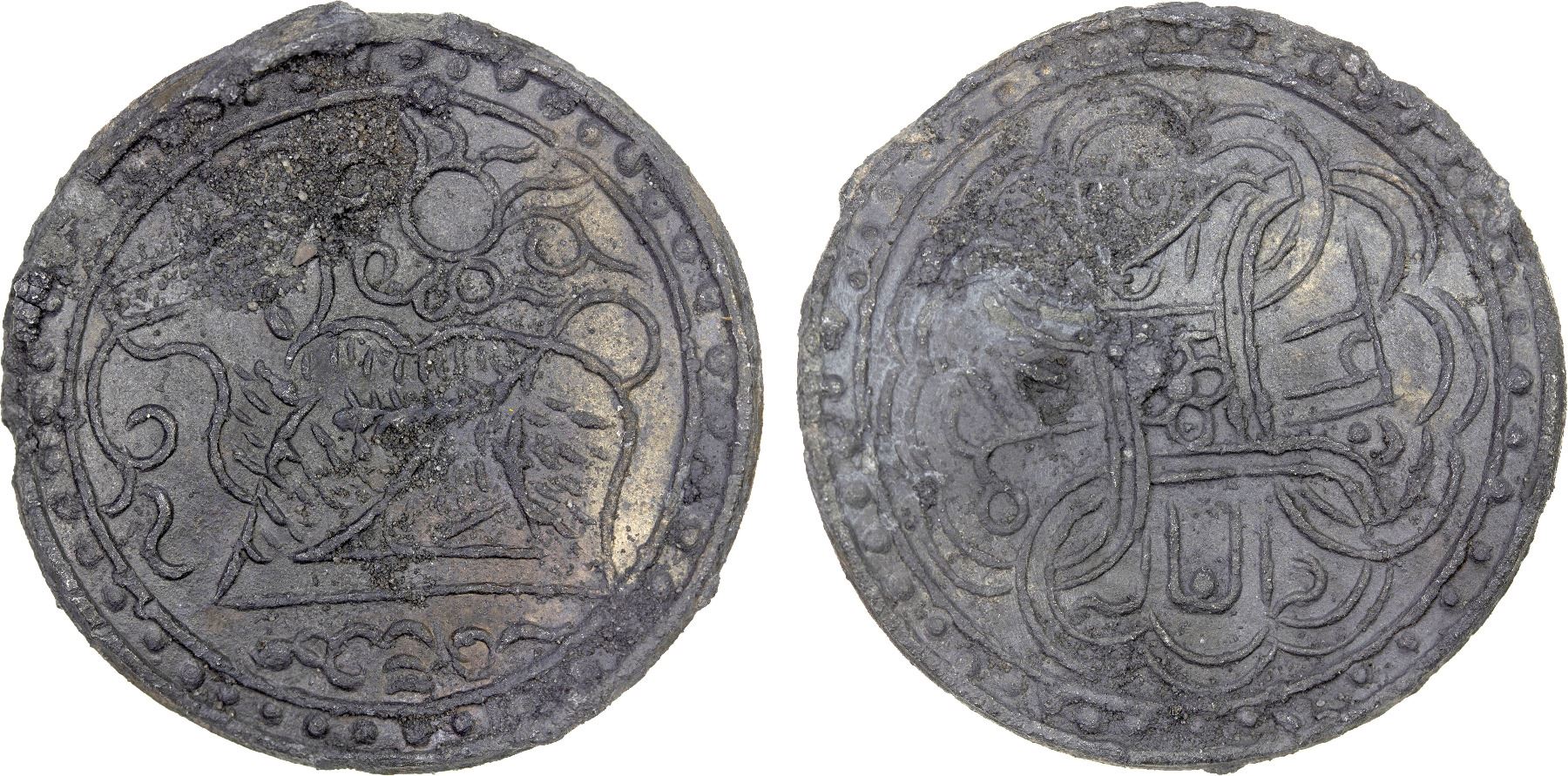 BRUNEI: Anonymous, 18th-19th century, tin pitis (10.66g), SS-15A, camel facing left, floral scrolls above & below // Arabic honorific title al-sultan al-'adil malik al-zahir within 4 interlocked clouds, 4-petal flower in the center; almost no weakness, but one corrosion spot on both sides, still an excellent example! choice EF, R.