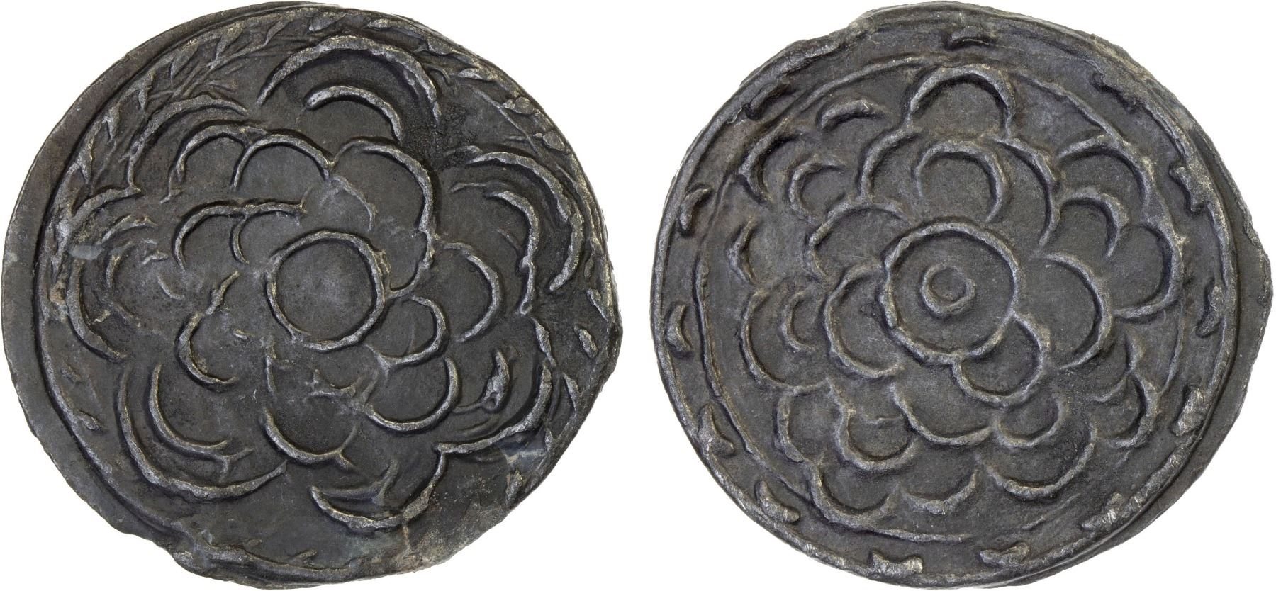 BRUNEI: Anonymous, 18th/19th century, tin pitis (2.87g), SS-33/41, flowery pattern both sides, perhaps the finest examples we have seen, lovely XF, R. SS-33/41 are actually just minor varieties of a single type, except for SS-38, which has different borders on both sides.
