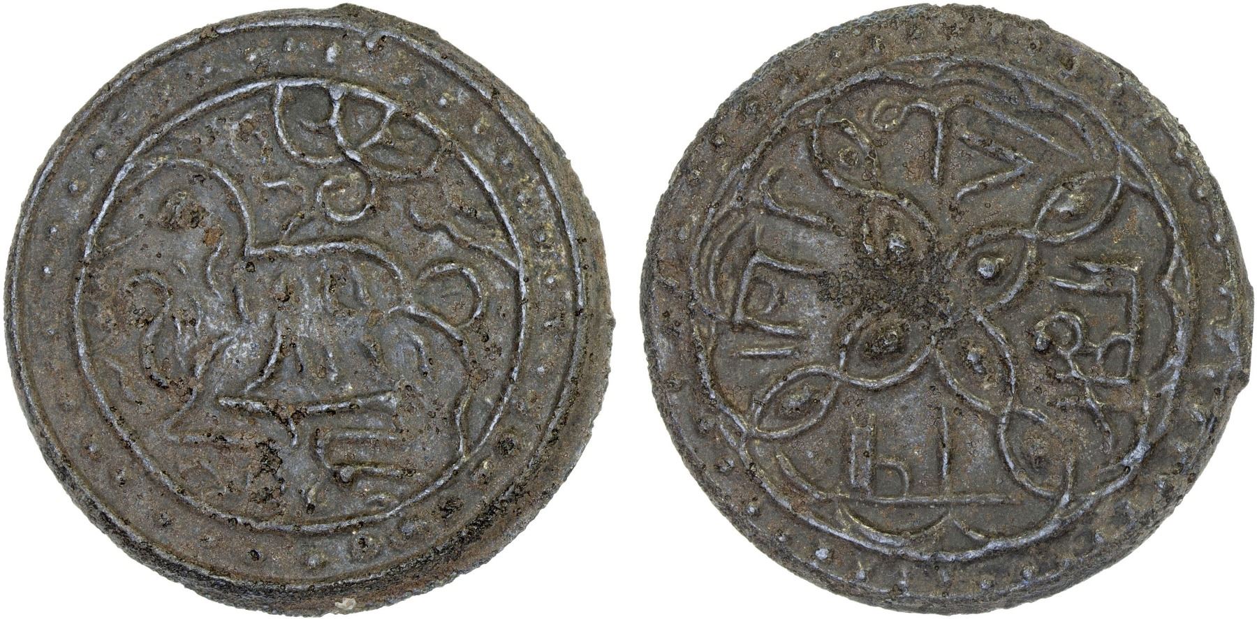 BRUNEI: Anonymous, 18th/19th century, tin pitis (4.59g), SS-13H, camel facing left, resting beneath the clouds, tail raised // Arabic honorific title al-sultan al-'adil malik al-zahir within dodecafoil with central flower, VF, R.