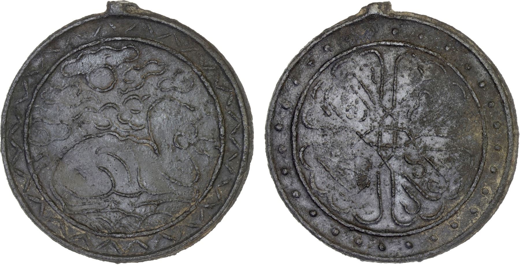 BRUNEI: Anonymous, 18th/19th century, tin pitis (6.06g), SS-18A, camel facing right, floral scrolls above, zigzag design within the border // Arabic honorific title al-sultan al-'adil malik al-zahir within fancy millsail pattern; part of the original casting sprue still attached, strong VF, RR.