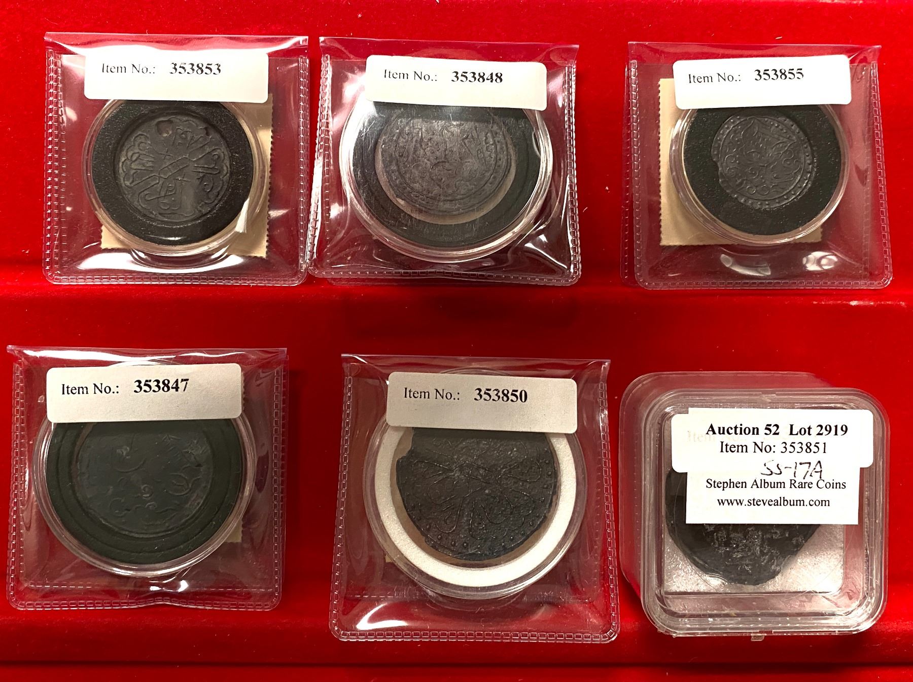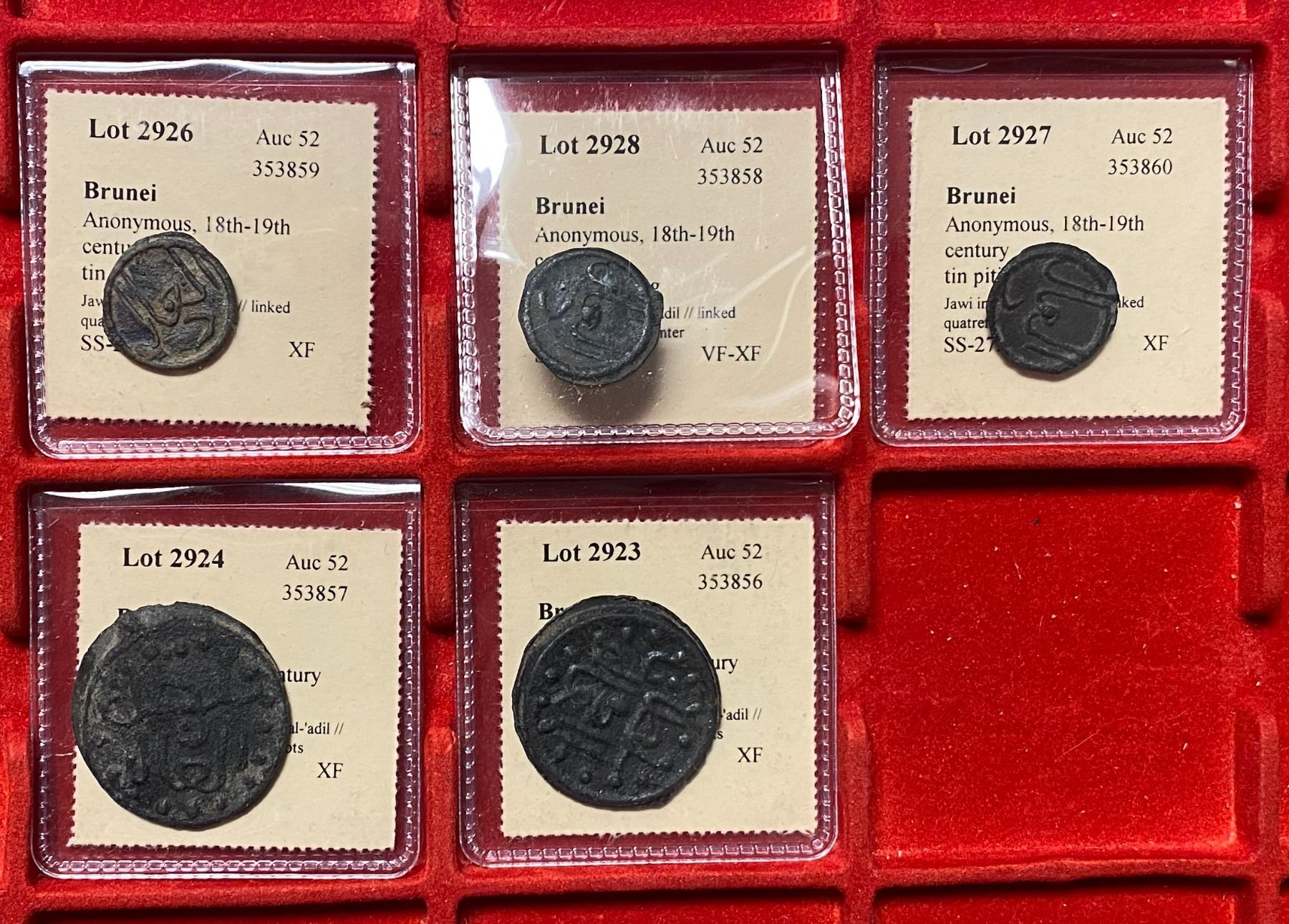 BRUNEI: LOT of 11 coins, all tin issues from the 16-19th century, many with camel design, including SS-13C, 13H, 17A, 17C, 17var, 23B (2 pieces), 27A (3 pieces), plus an early pitis with a serpent-like animal; most in EF conditions, several quite lovely, a few with minor edge chips or small casting holes, all attributed on accompanying holders; retail value $800, lot of 11 pieces.
