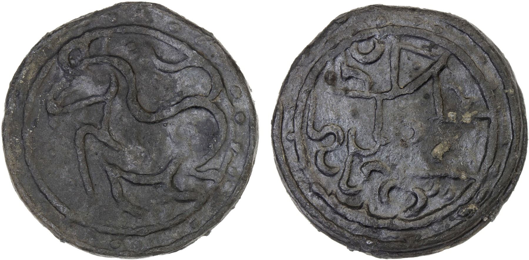 BRUNEI: Sultan Kamaluddin, 1710-1730 & 1737-1740, tin pitis (4.55g), SS-3F (same dies), cat facing left within border of dots // blundered Arabic text sultan kamalddin (malik al-zahir); local unofficial issue, strong VF-XF, RR.