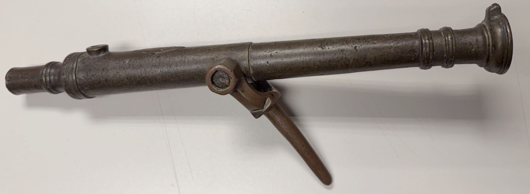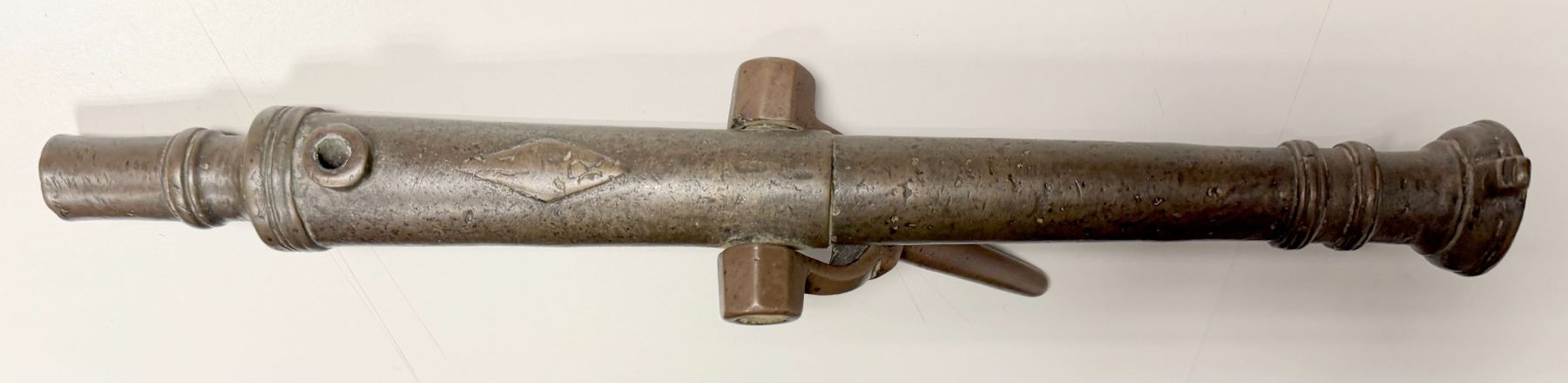 BRUNEI: brass cannon money (1997g), 19th to early 20th century, SS-59, Opitz p.100, known in Malay as rentaka, comprising a 380mm-long barrel (17mm caliber), plain except for a single diamond-shaped symbol, attached with a swivel handle underneath, used as a practical hand-held weapon and as currency in Brunei, Sabah, Sarawak and other parts of Southeast Asia, VF, ex Jürgen M. Wilmes Collection. These miniature cannons were made of various metals including bronze, brass, copper, and iron, and were actually fired on important occasions such as weddings and the birth of children. Valued by weight at $25-30 a picul, they were used extensively for a multitude of purposes, such as the barter of goods, bride price, payment of fines and the purchase of slaves (a slave being valued in piculs of brass guns). With the introduction of coins, these cannons gradually fell out of use. Many were also melted down during World War II, which accounts for their rarity today.
