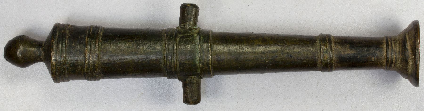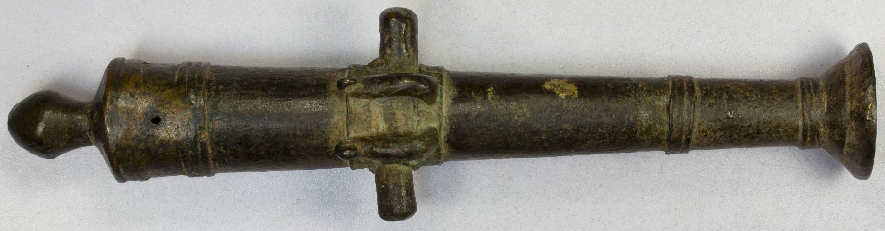 BRUNEI: brass cannon money (541g), 19th to early 20th century, SS-60, Opitz p.100, known as meriam kecil in Malay, comprising a 213mm-long barrel with a 13mm caliber, decorated with two protruding fish, an older example made in the mid-19th century or earlier, used as currency in Brunei, Sabah, Sarawak and other parts of Southeast Asia, VF-XF. These miniature cannons were made of various metals including bronze, brass, copper, and iron, and were actually fired on important occasions such as weddings and the birth of children. Valued by weight at $25-30 a picul, they were used extensively for a multitude of purposes, such as the barter of goods, bride price, payment of fines and the purchase of slaves (a slave being valued in piculs of brass guns). With the introduction of coins, these cannons gradually fell out of use. Many were also melted down during World War II, which accounts for their rarity today.