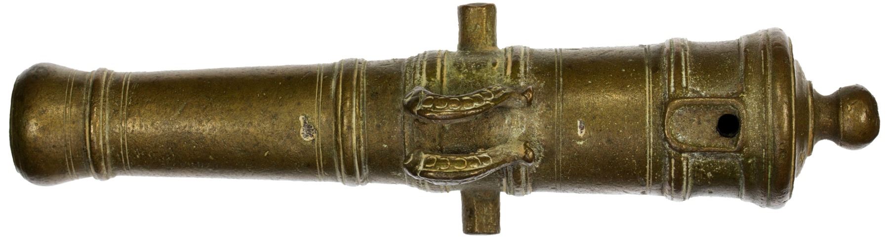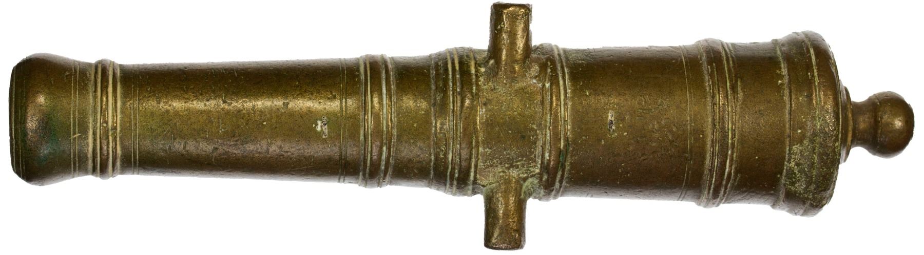 BRUNEI: brass cannon money (729g), 19th to early 20th century, SS-60, Opitz p.100, known as meriam kecil in Malay, comprising a 175mm-long barrel with a 10mm caliber, decorated with two protruding fish, used as currency in Brunei, Sabah, Sarawak and other parts of Southeast Asia, Choice VF. These miniature cannons were made of various metals including bronze, brass, copper, and iron, and were actually fired on important occasions such as weddings and the birth of children. Valued by weight at $25-30 a picul, they were used extensively for a multitude of purposes, such as the barter of goods, bride price, payment of fines and the purchase of slaves (a slave being valued in piculs of brass guns). With the introduction of coins, these cannons gradually fell out of use. Many were also melted down during World War II, which accounts for their rarity today.