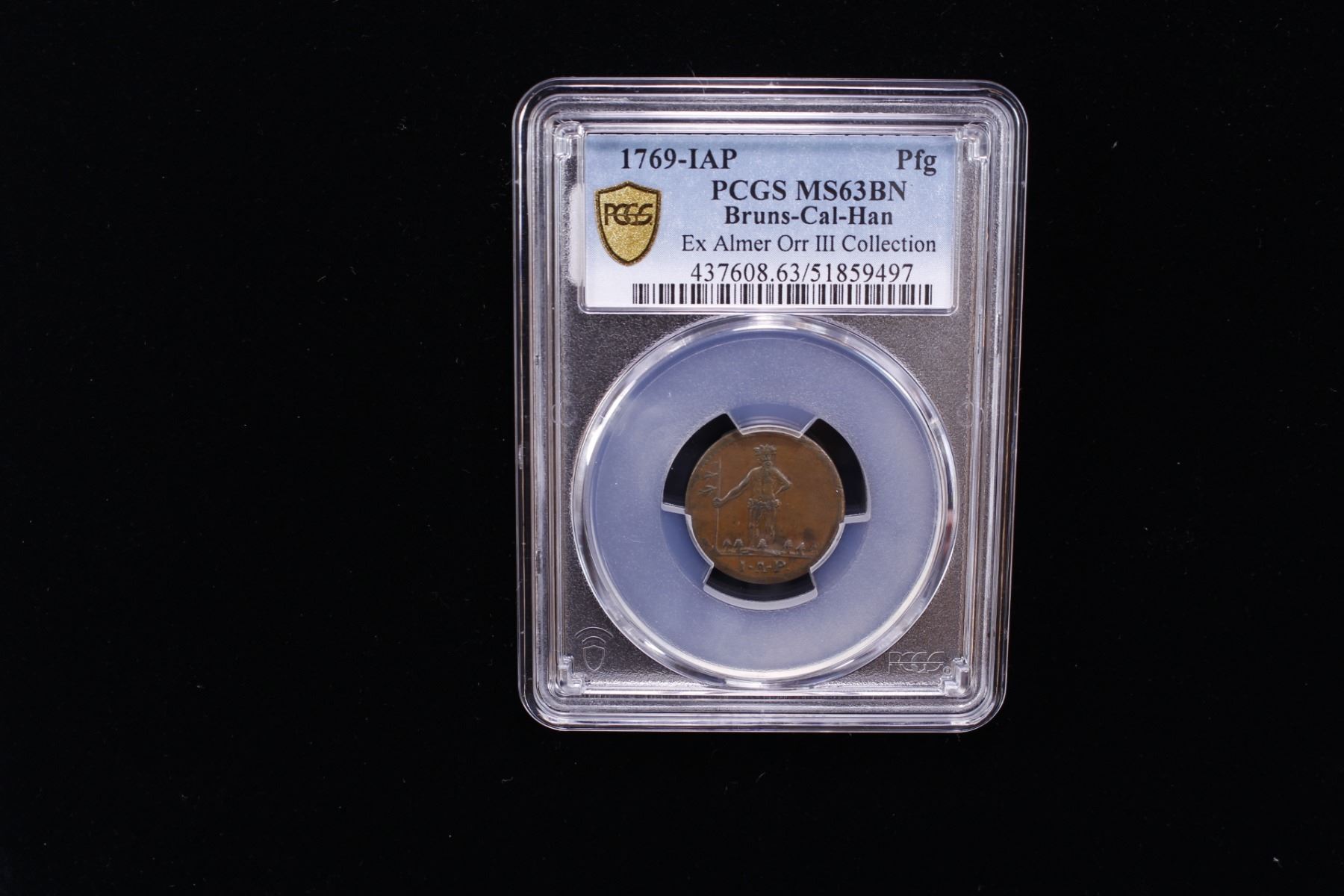 BRUNSWICK-CALENBERG-HANNOVER: Georg III, 1760-1820, AE pfennig, 1769, KM-330, Johann Anton Pfeffer, Mint Master, a lovely example, PCGS graded MS63 BN, ex Almer H. Orr III Collection.