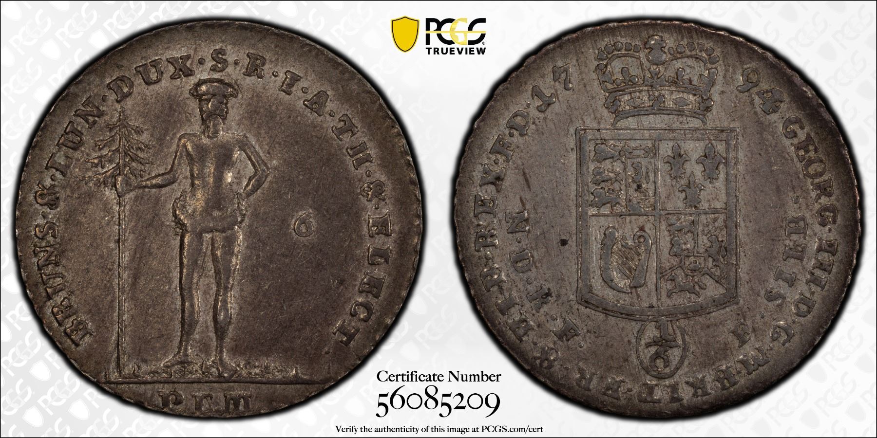 BRUNSWICK-CALENBERG-HANNOVER: George III, 1760-1820, AR 1/6 thaler, Clausthal, 1794, KM-401, mintmaster initials PLM, 'WIldman' type, British coat of arms, an attractive nearly mint state example, PCGS graded AU58. The concept of the Wildman dates back to mythological beings in the ancient cultures of Greece and Rome. Moritz Wormser's November 1916 article in The Numismatist states that "he is a descendant of the Greek Satyr and the Roman Faun." Throughout medieval Europe, the Wildman was used to instill fear in the local villagers to subscribe to certain religious beliefs. The Brunswick Duchies of north-central Germany are located in the silver rich region that includes the Harz Mountains. The myth that was created adapted the Wildman as a local guardian who protected the silver from would-be thieves. No matter which Wildman myth one hears, he is usually depicted the same: large and muscular, nude, or nearly so, and covered in thick body hair, often wearing a wreath of leaves around his loins and as a crown about his brow.