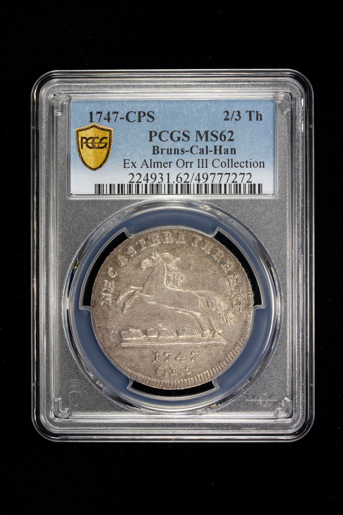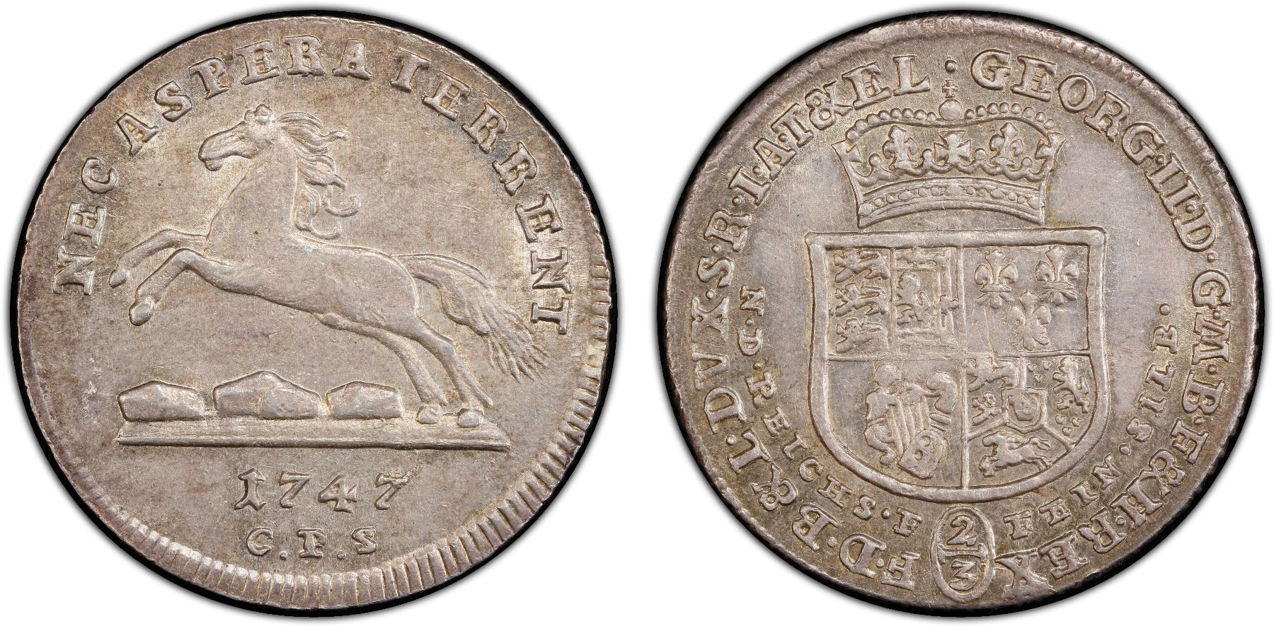 BRUNSWICK-LÜNEBURG-CALENBERG: George II, 1727-1760, AR 2/3 thaler, Clausthal, 1747, KM-277, Welter-2584, CPS mintmaster, an attractive lustrous mint state example, PCGS graded MS62, ex Almer Orr III Collection. With King George II's full style titles as "George the Second, by the Grace of God, King of Great Britain, France and Ireland, Defender of the Faith, Duke of Brunswick-Lüneburg, Archtreasurer and Prince-Elector of the Holy Roman Empire."