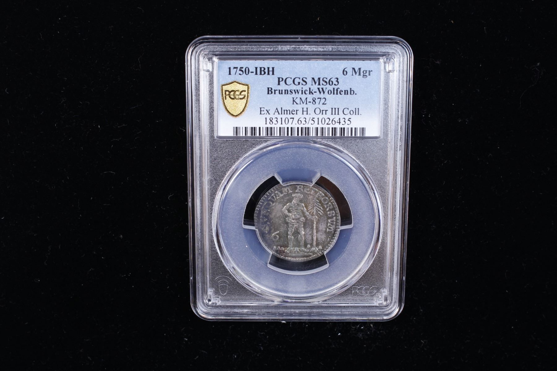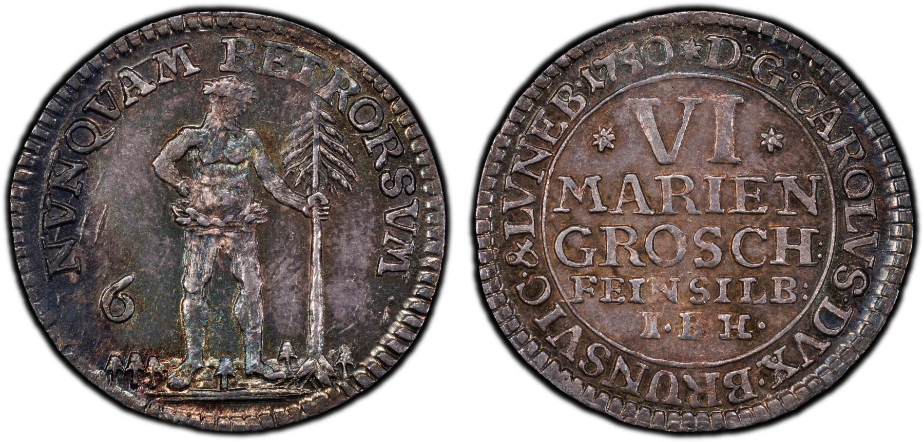 BRUNSWICK-WOLFENBÜTTEL: Karl I, 1735-1780, AR 6 mariengroschen, Zellerfeld, 1750, KM-872, "Wildman" type, a lovely mint state example! PCGS graded MS63, ex Almer H. Orr III Collection. The Braunschweig Wildman refers to a mythological figure popularized in the Duchy of Brunswick-Lüneburg during the 16th to 18th centuries, particularly associated with the Harz Mountains region. This Wildman, often depicted as a hairy, muscular figure, and often holding a tree, was seen as both a protector of the silver mines and a symbol of the region, appearing on coins, in heraldry, and in folklore.