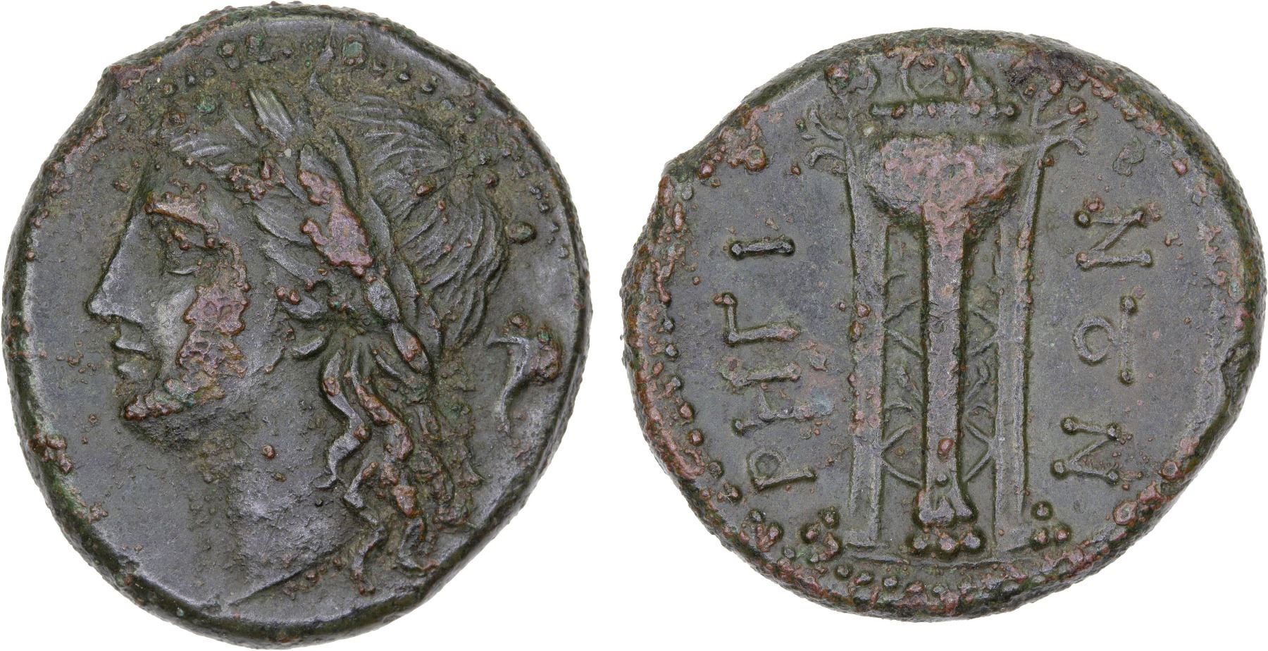 BRUTTIUM: Rhegion, AE unit (7.26g), ca. 260-215 BC, HNI-2543, SNG ANS 720, laureate head of Apollo left, cornucopia behind // tripod, PHΓI-NΩN, attractive dark green patina, XF