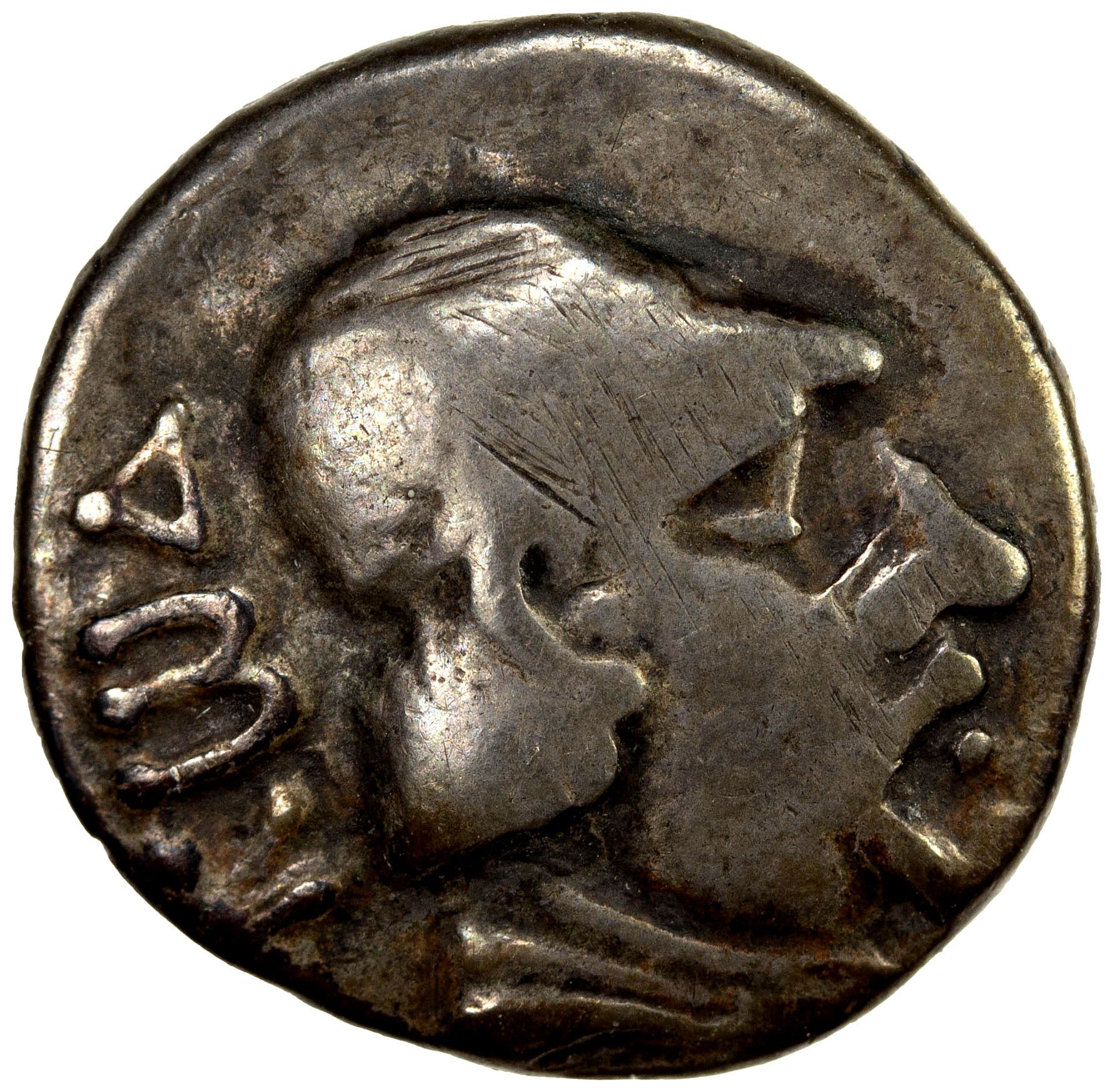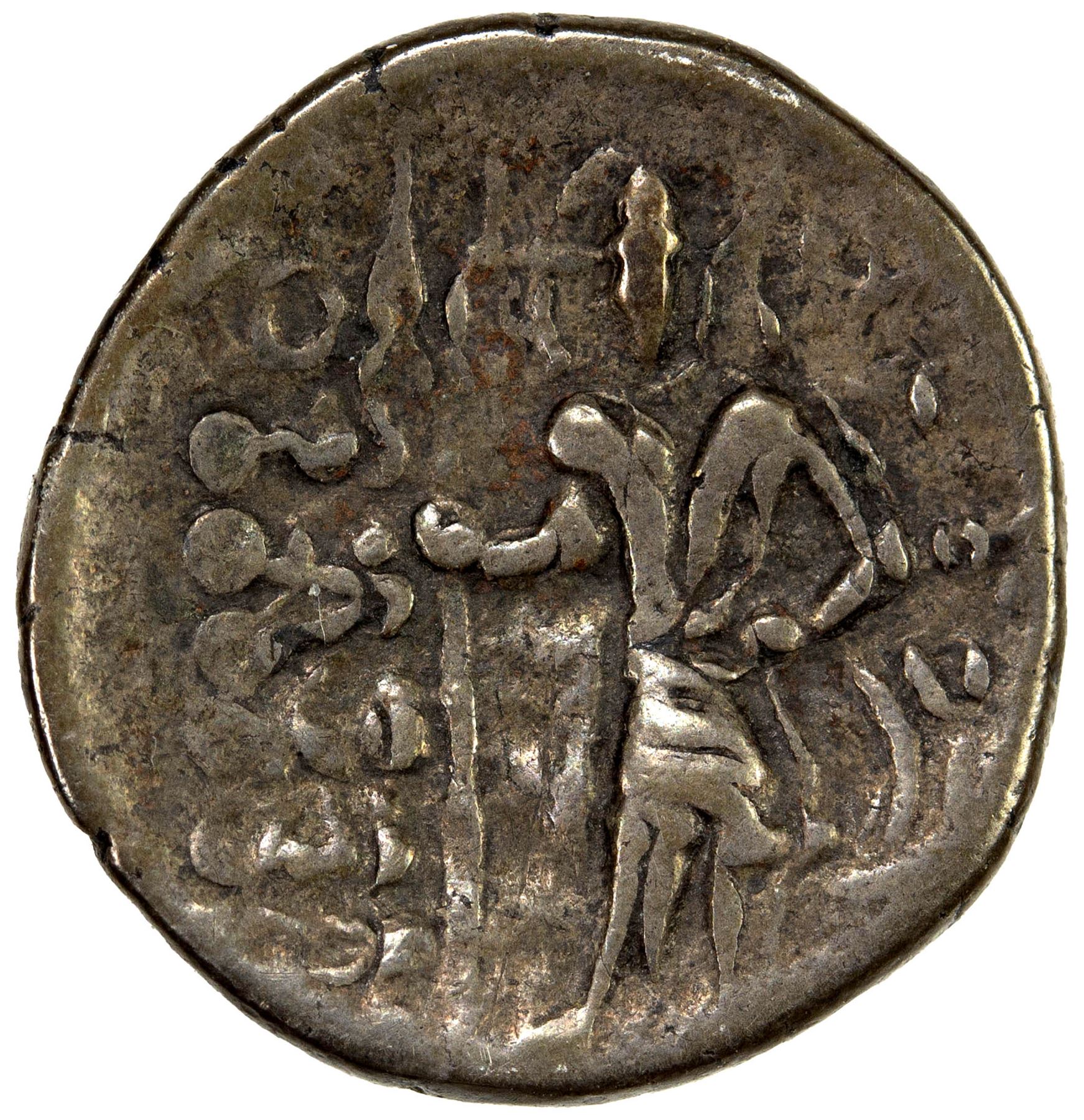 BUKHARA: "Hyrkod", 1st century BC to 2nd AD, AR unit (1.89g), Zeno-20184, bust right, with wispy beard // standing deity, holding long spear, partially legible Greek legends on both sides, VF.