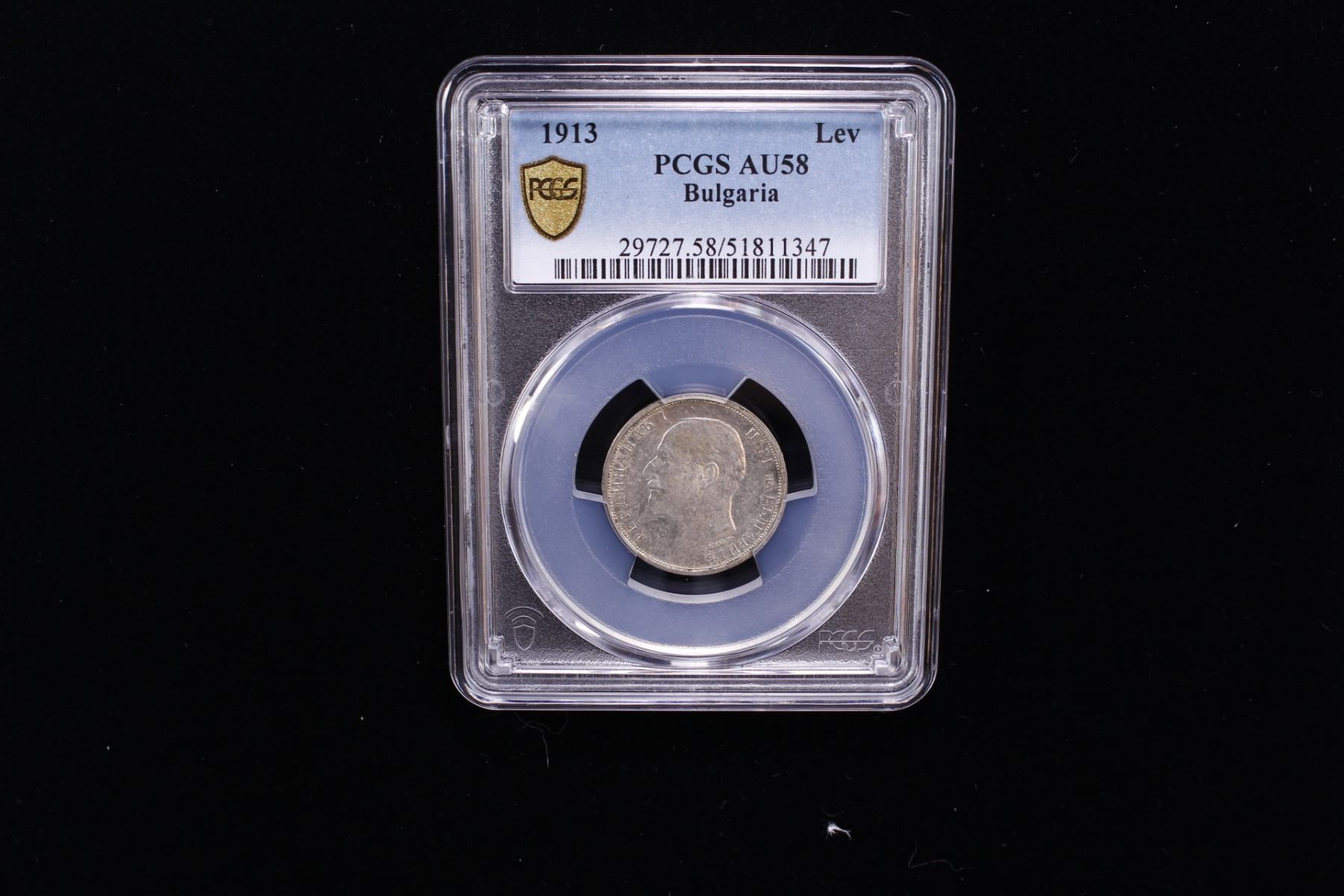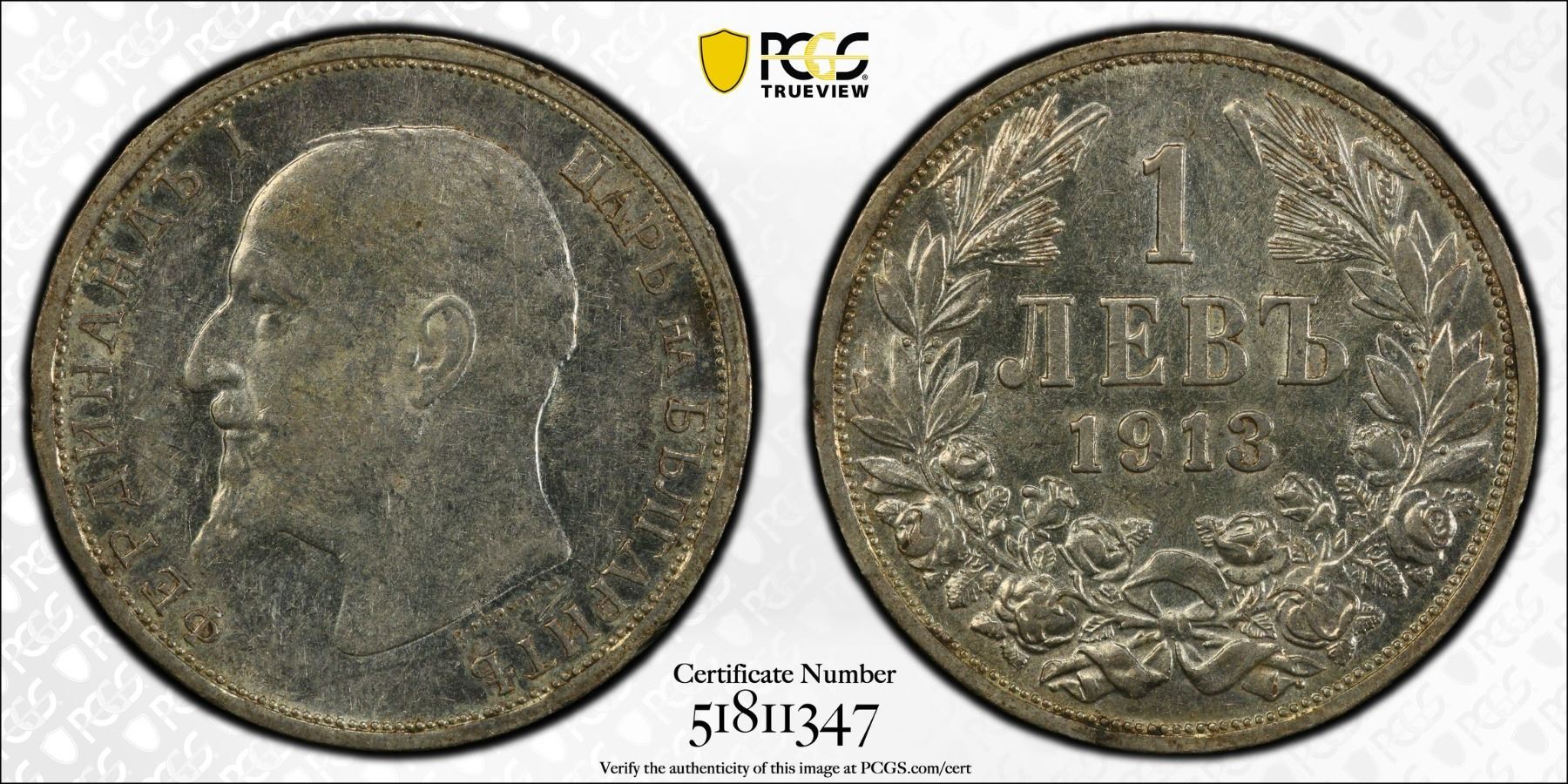 BULGARIA: Ferdinand I, 1887-1918, AR lev, 1913, KM-31, PCGS graded AU58, ex Almer H. Orr III Collection.