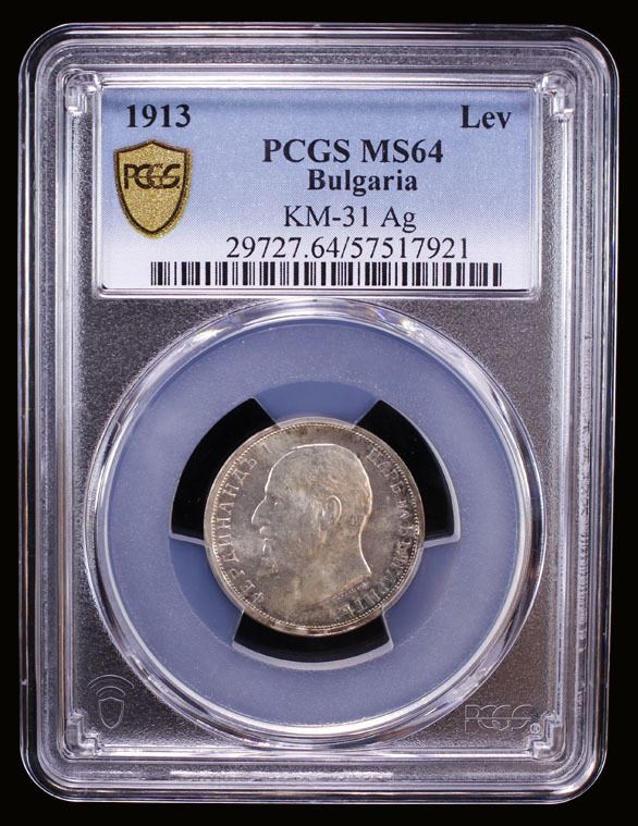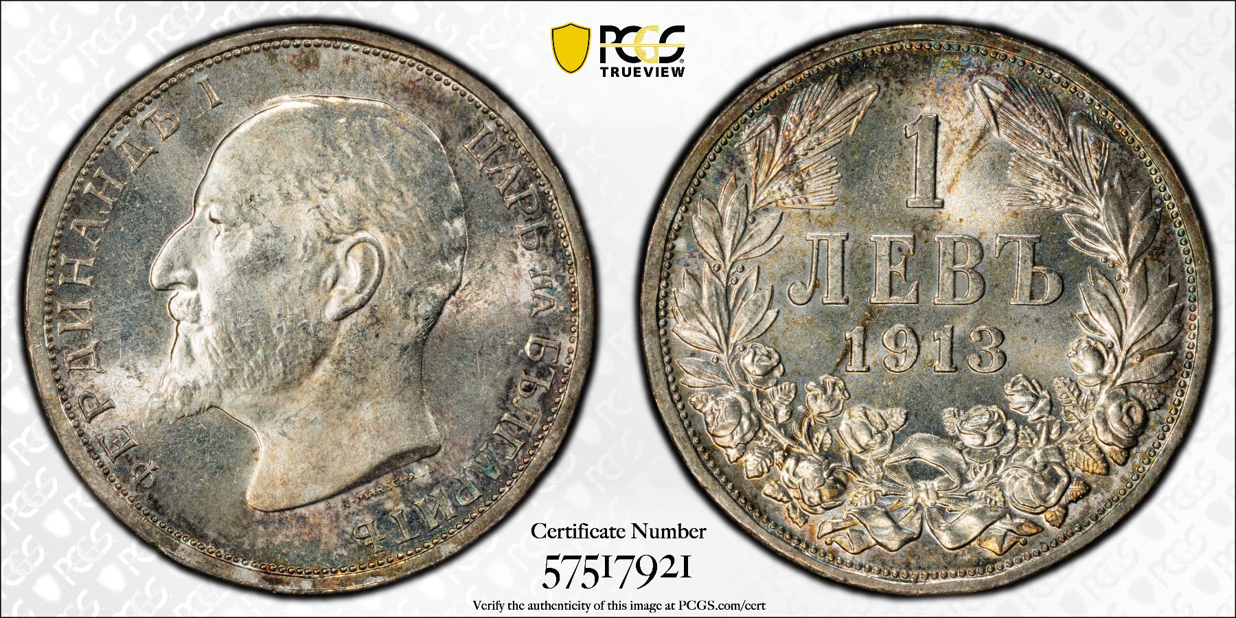 BULGARIA: Ferdinand I, 1887-1918, AR lev, 1913, PCGS MS64