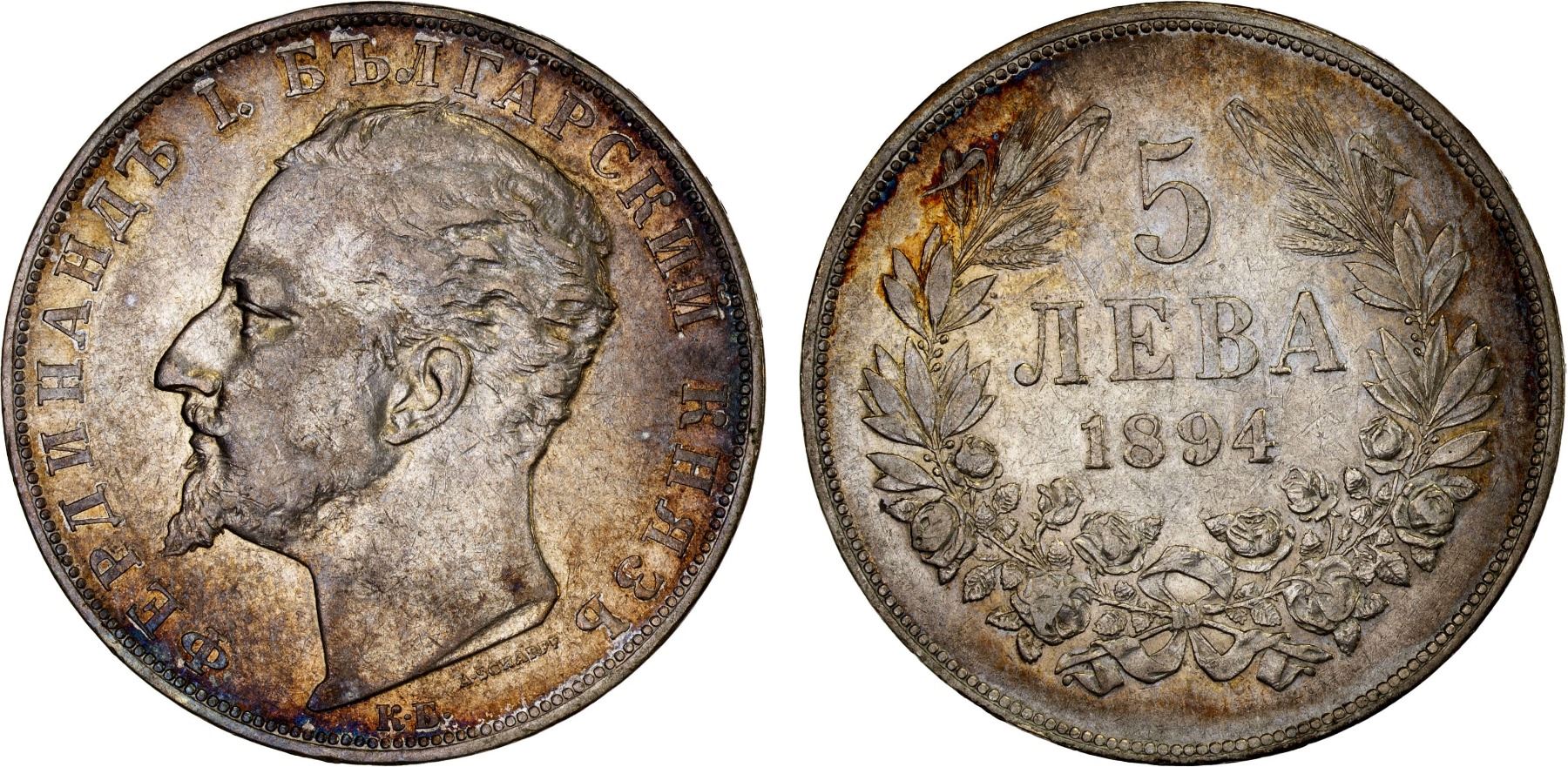 BULGARIA: Ferdinand I, prince, 1887-1908, AR 5 leva, 1894 KB, KM-18, toned, XF.